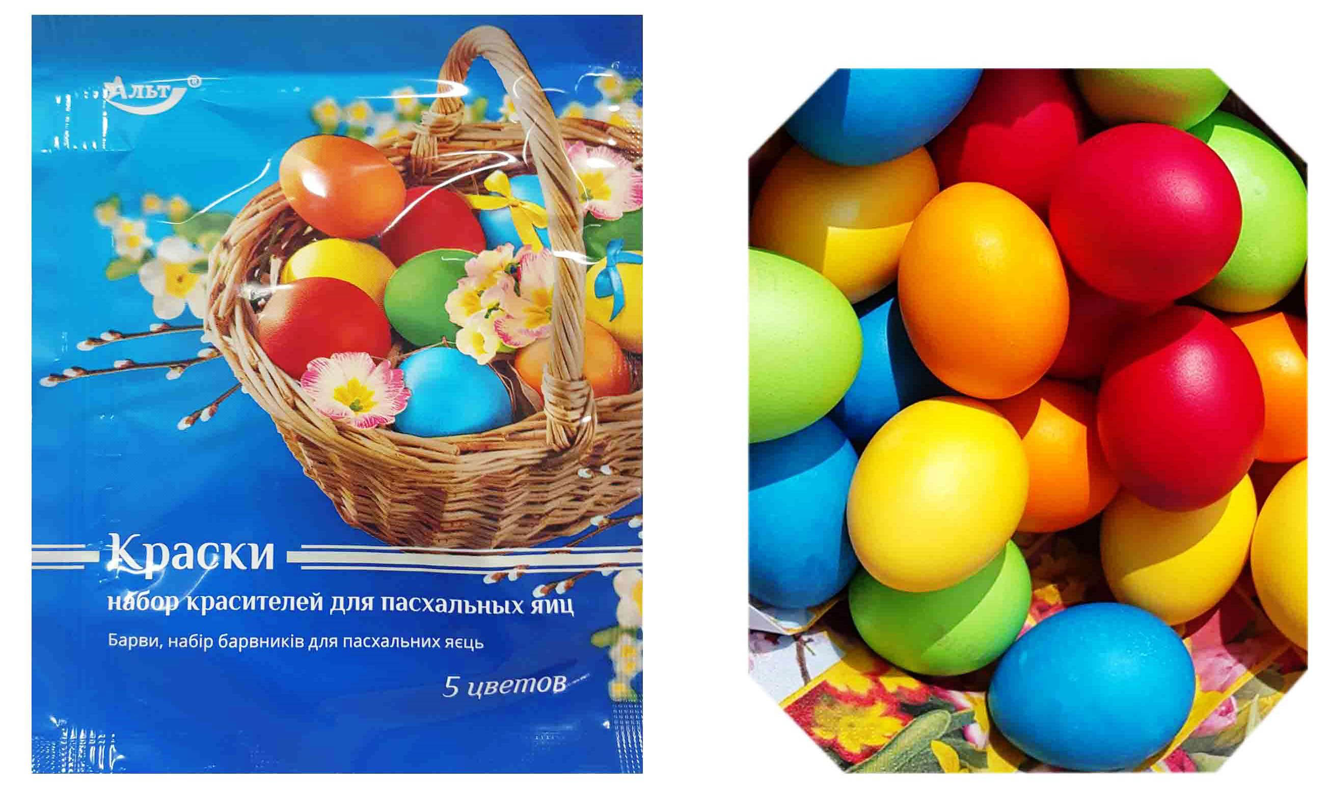 Způsob použití: obsah jednoho balení vsypte do 250 ml horké vody 70-90°C. Přidejte 1 polévkovou lžíci 9% octa. Důkladně promíchejte. Do vzniklého roztoku vložíme na 1-2 minuty čistá, předem uvařená vejce (nejlépe horká). Vejce vyndejte na utěrku, nebo papír k sušení. Chcete-li přidat lesk, namažte je rostlinným olejem nebo tukem.