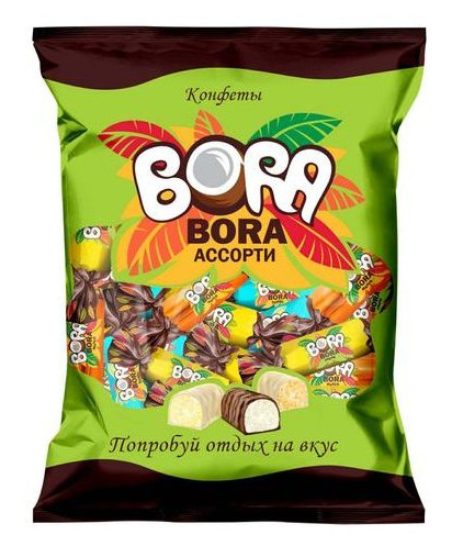 Bonbóny "Bora-Bora Assorti" o hmotnosti 200 gramů představují směs tří příchutí: kokos, mango a citron. Každý druh bonbónu obsahuje jemný krém s kokosovou dužinou a je pokryt čokoládovou polevou.