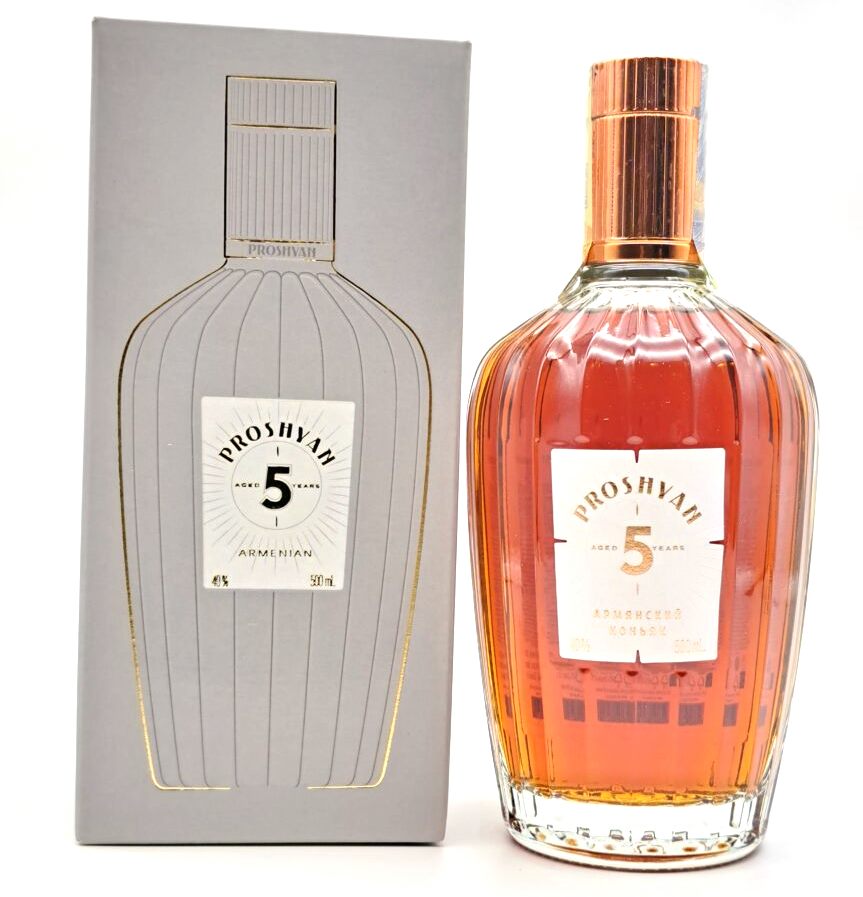Brandy 5 let 0,5L 40% PROSHYAN se vyrábí podle tradiční metody výroby cognacu z hroznového vína odrůdy Kangun pěstované na vinicích v Arménii. Vyvážené brandy jantarové barvy s lehkými odstíny mahagonu má čokoládovo dřevitou chuť a vůni. Vyniká svou plností, jemností a dlouhotrvající chutí. Doba zrání brandy v dubových sudech je minimálně 5 let. Doporučujeme podávat při pokojové teplotě.