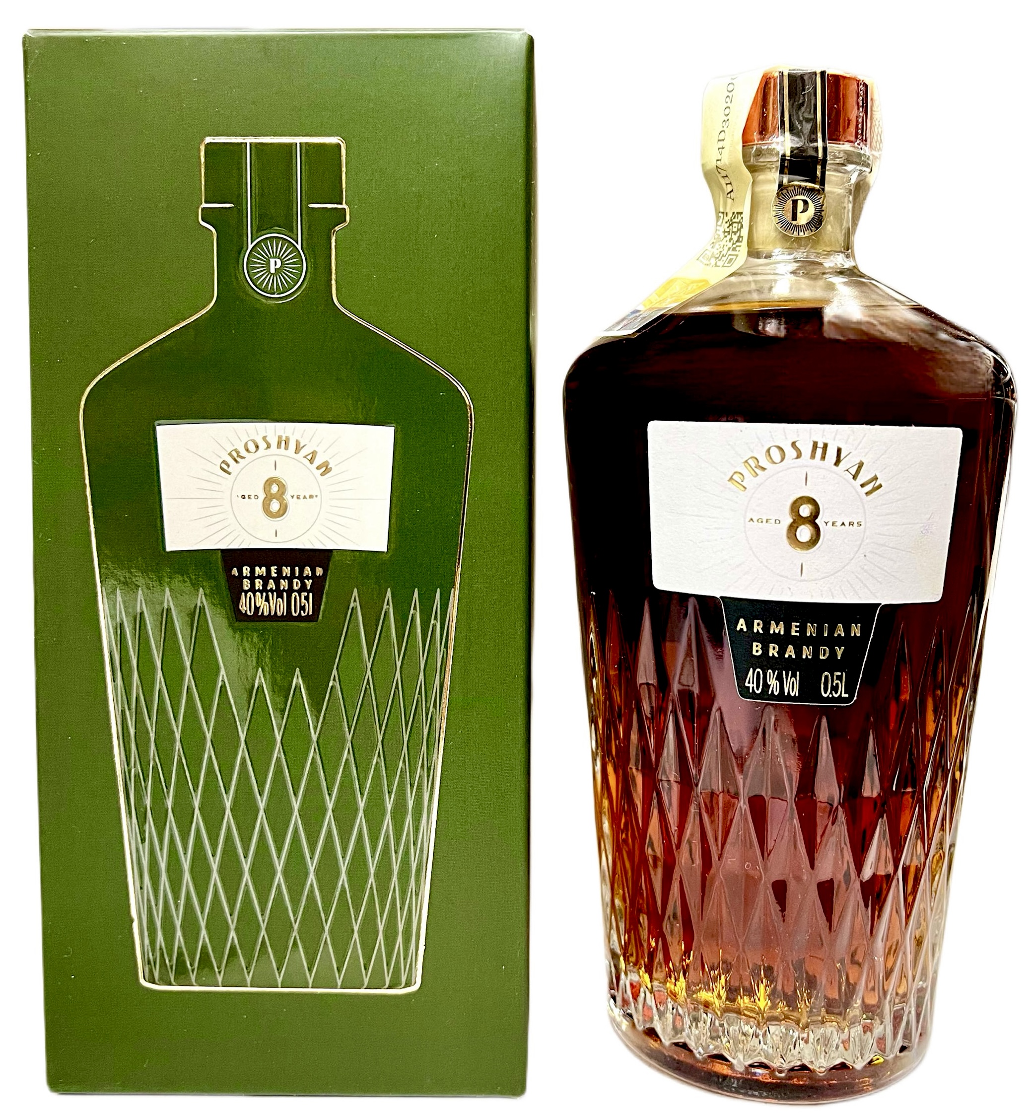 Brandy 8 let 0,5L 40% PROSHYAN se vyrábí podle tradiční metody výroby cognacu z hroznového vína odrůdy Kangun pěstované na vinicích v Arménii. Vyvážené brandy jantarové barvy s lehkými odstíny mahagonu má čokoládovo dřevitou chuť a vůni. Vyniká svou plností, jemností a dlouhotrvající chutí. Doporučujeme podávat při pokojové teplotě.