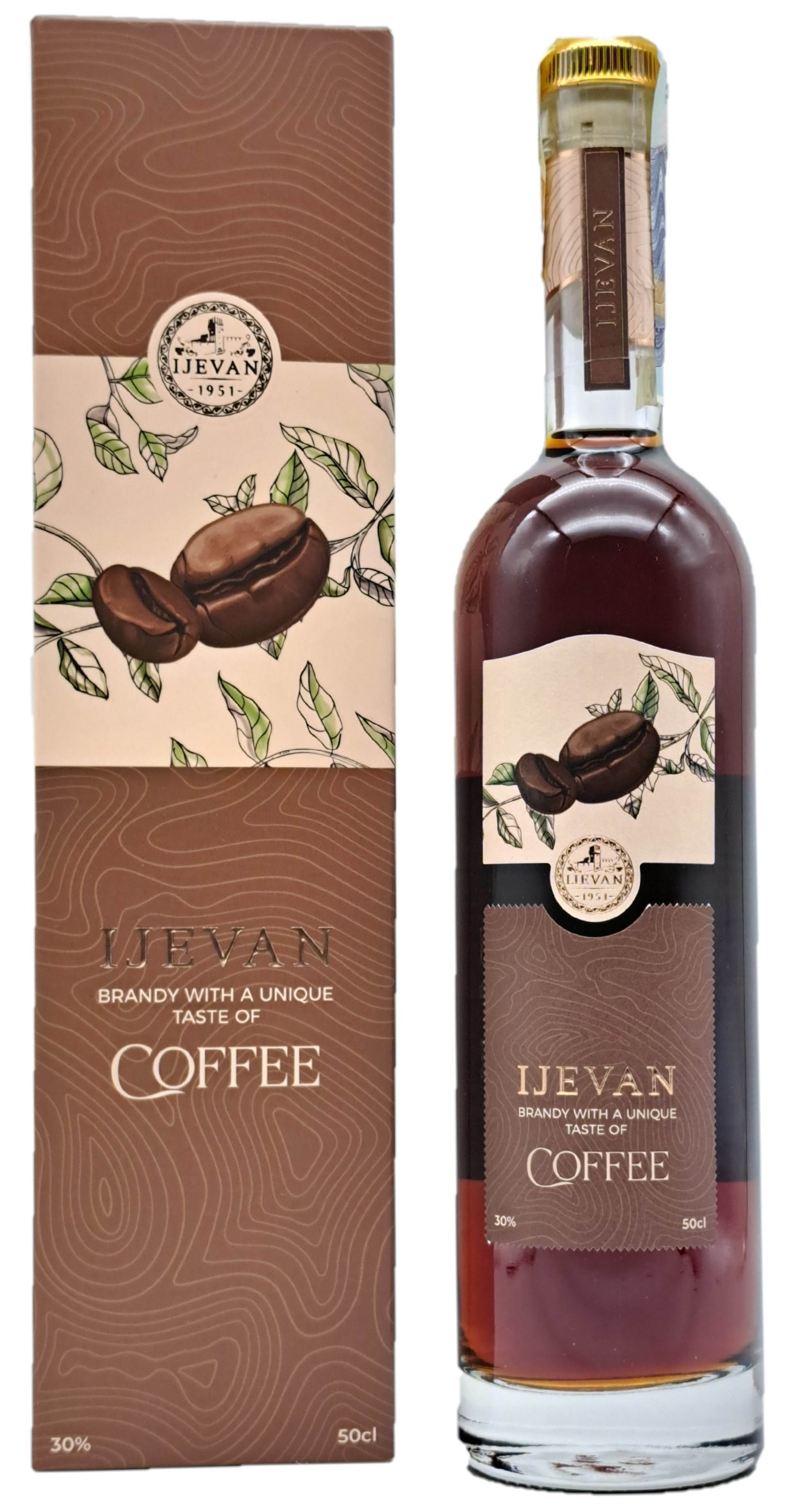 Brandy kávový 7 let 0,5L 30% IJEVAN se vyrábí v městě Ijevan v Arménii. Brandy je charakteristické kaštanově hnědou barvou, vyniká jemnou chutí a vůní kávy. Vyniká také svou plností, jemností a dlouhotrvající chutí. Doba zrání brandy je minimálně 7 let. Doporučujeme podávat při pokojové teplotě.