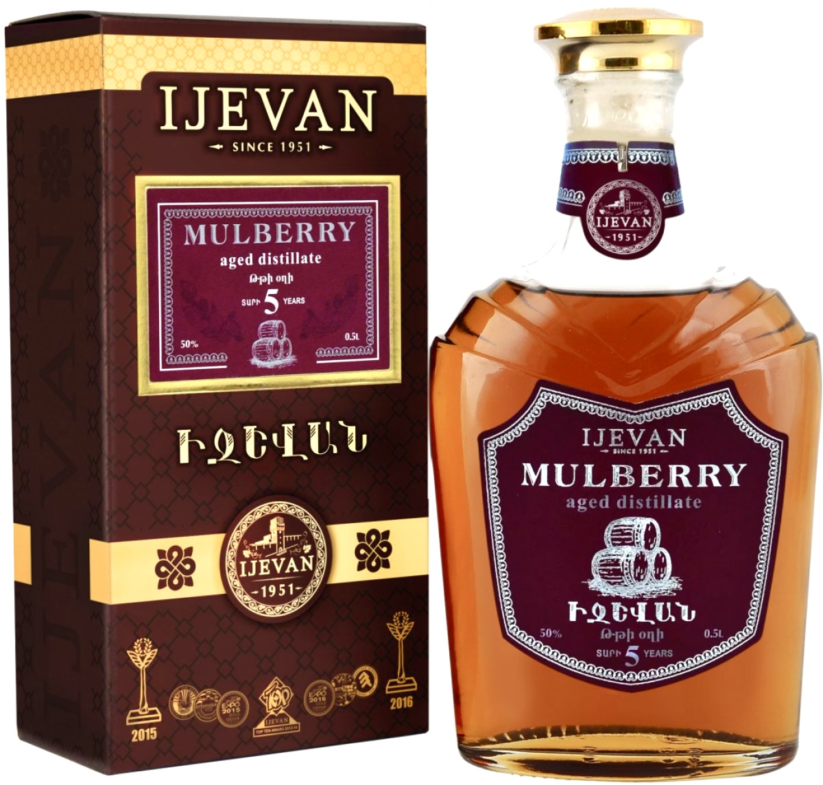 Brandy Mulberry 5 let 0,5L 40% IJEVAN se vyrábí z nejkvalitnější bílé moruše pěstované v Arménii v regionu Tavuš. Vynikající vyvážené brandy slámové barvy má výraznou chuť moruše. Vyniká svou plností, jemností a dlouhotrvající chutí. Doba zrání brandy v dubových sudech je minimálně 5 let. Doporučujeme podávat při pokojové teplotě.