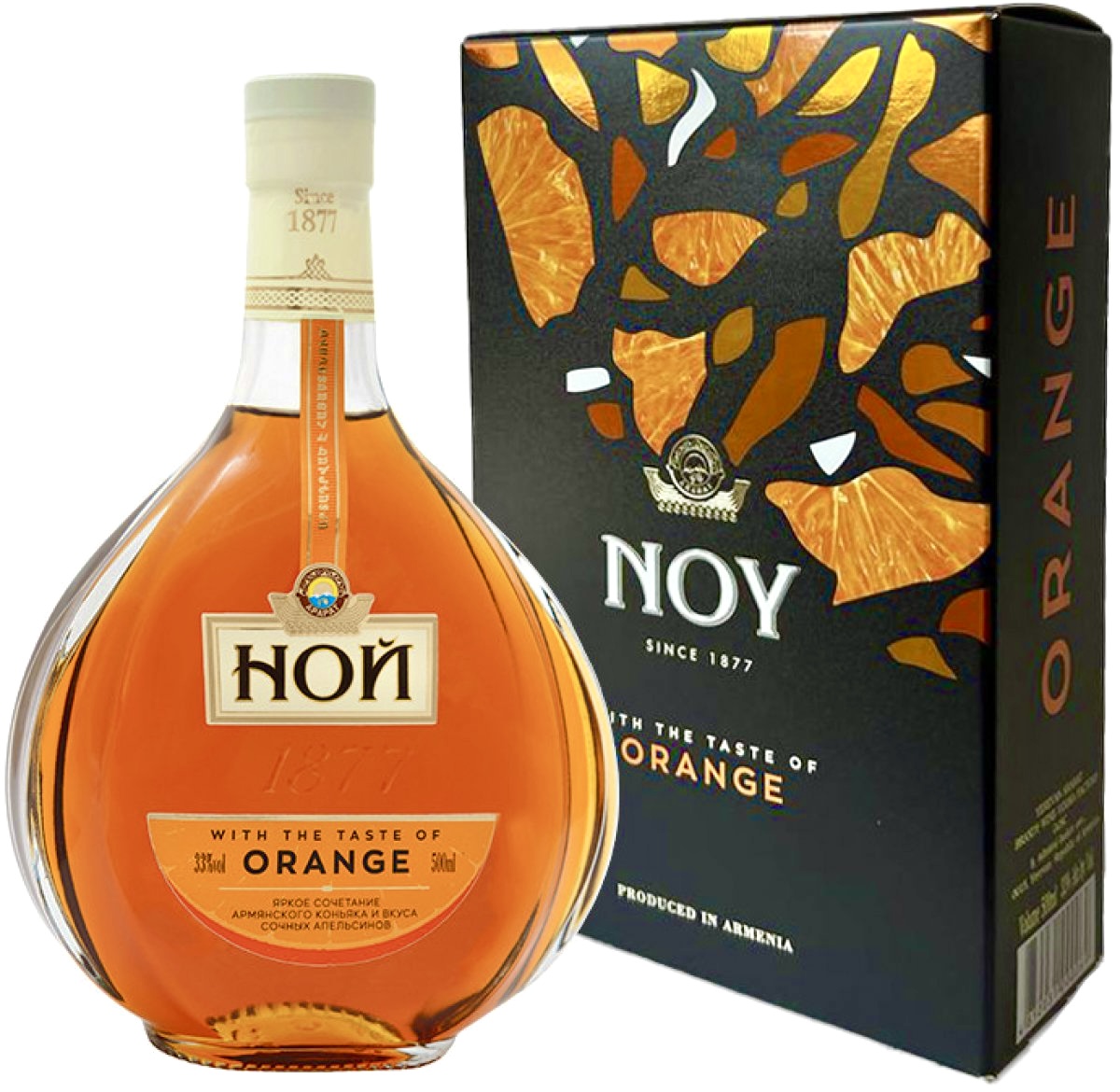 Brandy s příchutí pomeranče 33% 0,5L NOY je originálny nápoj s obsahom alkoholu 33%, predstavujúci jasné spojenie arménskeho koňaku a chuti zrelých pomarančov. Tento nápoj se doporučuje podávat jako digestiv, s ledem jako aperitiv nebo jako součást koktejlů. Brandy má zlatavě jantarovou barvu.