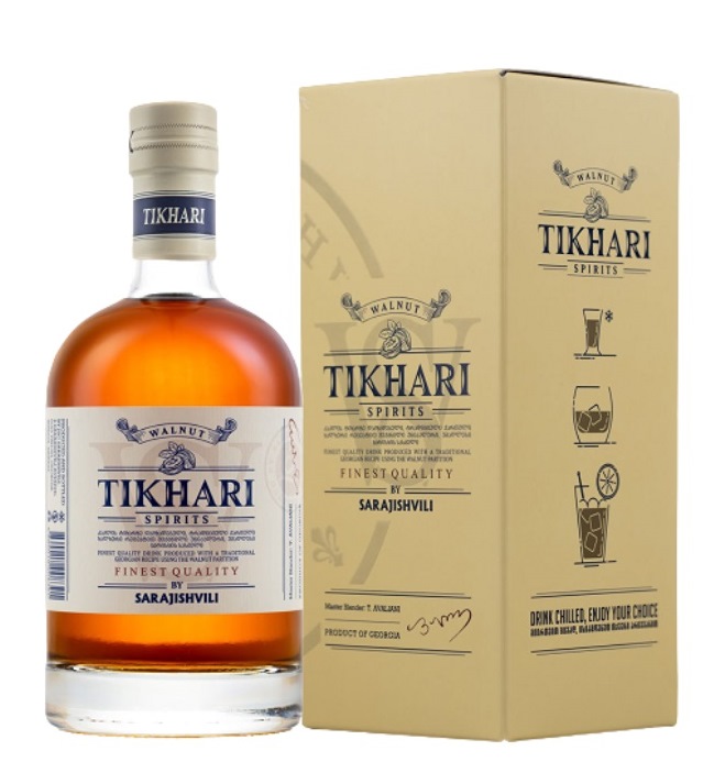 Brandy TIKHARI 0,5L 40% Sarajishvili je vyroben z tradičních odrůd hroznového vína Lalvari a Rkatsiteli pěstovaných na gruzínských vinicích v oblasti Kachetie. Součástí Tikhari je také extrakt přepážek z vlašských ořechů, který dodává nápoji jedinečnou chuť a vůni. Tikhari se vyznačuje jantarovou barvou, vyniká svou měkkostí a jemností. Doporučuje se pít po malých doušcích. Minimální doba zrání v dubových sudech je 5 let.