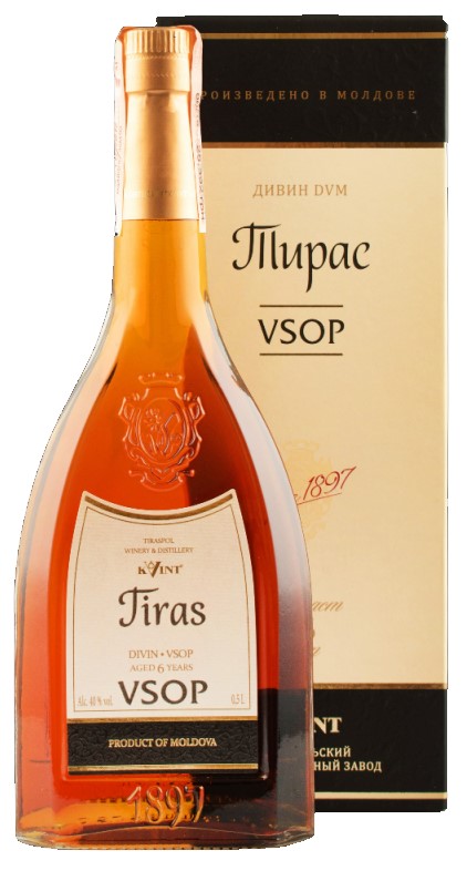 Brandy Tiras 6 let 0,5L 40% KVINT, vyráběná tradičním brandy způsobem z vybraných hroznů evropských a místních odrůd pěstovaných ve vinicích KVINT v Moldávii, zrajících nejméně 6 let v dubových sudech. Vyrábí se od roku 1897. Zlatá a jantarová barva této brandy je brilantní, nádherná. Vynikají zde květinové tóny.