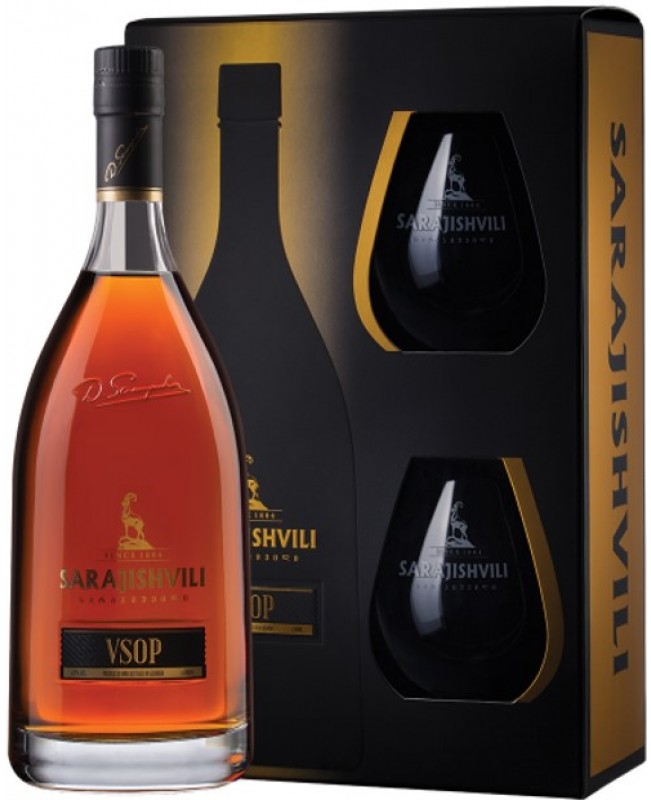 Přirozená rovnováha síly a harmonie vytváří z Brandy VSOP 0,7L 40% + 2 sklenice Sarajishvili výjimečný produkt, který je tvořen směsí prémiových lihovin vyráběných z gruzínských hroznů, z nichž doba zrání v dubových sudech nejstaršího z nich přesahuje 12 let. Brandy vyniká jantarovou barvou, chutí a vůní sušeného ovoce, švestek, skořice a vanilky, která je typická pro dlouhé zrání brandy. Brandy má dokonale vyváženou chuť, zároveň je však výrazná a intenzivní. Doporučuje se pít po malých doušcích, zahřáté na pokojovou teplotu.