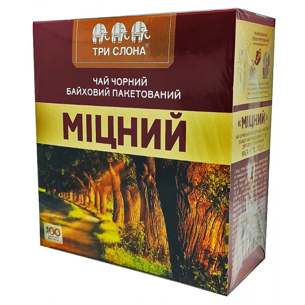 Černý čaj Silný Tři Sloni je klasický černý čaj v praktických filtračních sáčcích pro rychlou přípravu. Nápoj má plnou chuť, hlubokou jantarovou barvu a výrazné aroma. Vhodný pro každodenní konzumaci, a to jak samotný, tak s přídavkem cukru, citronu nebo mléka.
