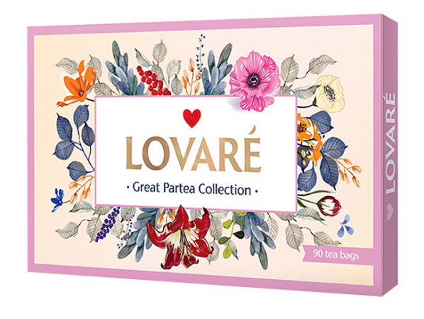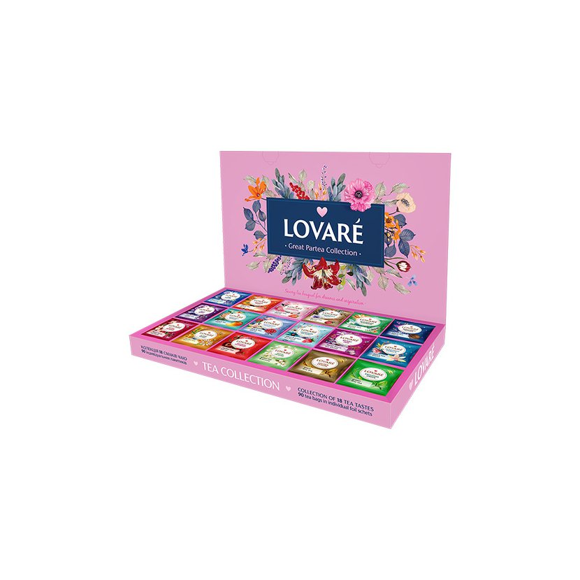 LOVARÉ Great Partea Collection je kolekce oblíbených příchutí porcovaných čajů Lovaré. Potěší milovníky černého, zeleného, bylinného, ovocného čaje a čaje rooibos. Pestrobarevné dárkové balení je ideální jako dárek pro vaše blízké. Kolekce obsahuje 18 příchutí po 5 sáčcích, což umožňuje vyzkoušet různé druhy čaje a najít si svého favorita.
