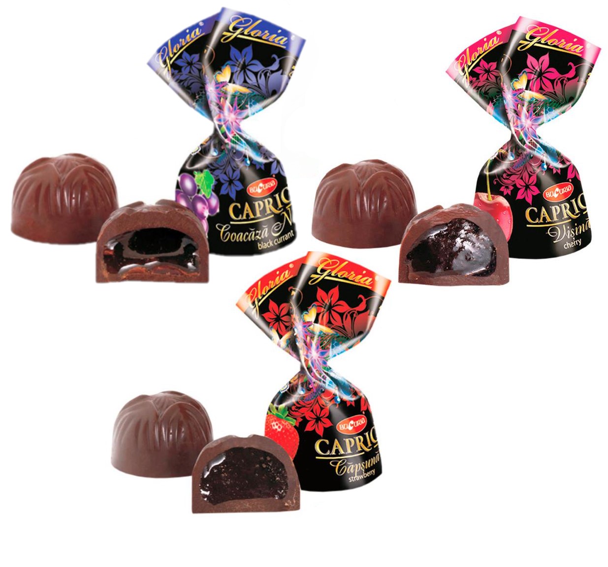 Bonbóny 'Caprice' od moldavského výrobce Bucuria - to je pravé potěšení pro milovníky čokolády. V každém bonbónu najdete ovocně-želé náplň s extraktem jahod, obalenou nejjemnější čokoládou. Dovolte si okamžik potěšení s těmito vybranými dobrotymi.