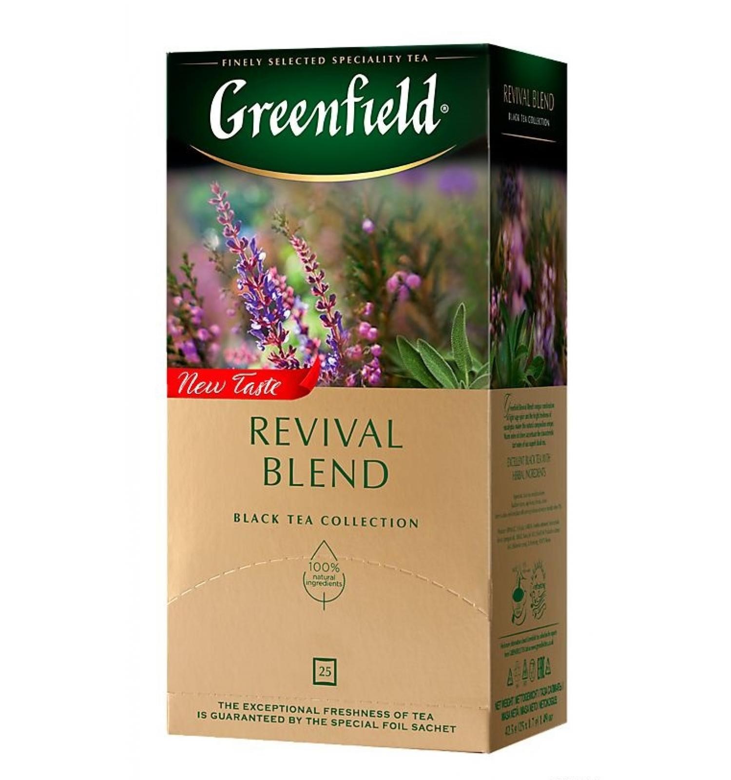 Černý čaj Greenfield Revival Blend (25 sáčků po 1,7 g) je aromatizovaný čaj s přídavkem šalvěje, eukalyptu, ibišku, ostružinových listů a hřebíčku, který vytváří osvěžující a kořeněnou chuť. Je oblíbený mezi milovníky čaje díky svému jedinečnému složení a výraznému aroma.