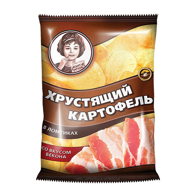 Složení: čerstvé brambory, rafinovaný deodorizovaný slunečnicový olej, slaninové aroma (pšeničná mouka, sůl, glukóza, zvýrazňovače chuti a vůně (E621, E627, E631), kvasnicový extrakt, přírodní aromatické látky, aromatické látky, česnekový prášek, barvivo (paprikový extrakt) proti spékavá látka (amorfní oxid křemičitý).