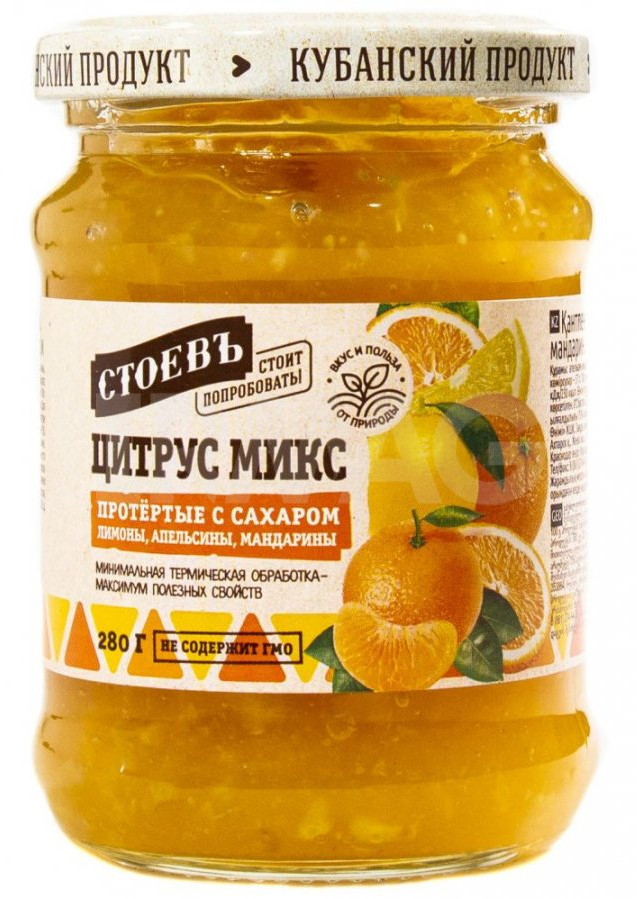 Protláčený citrusový mix s cukrem od značky „Stojev“ je přírodní produkt vyrobený z čerstvých citrusových plodů: citronů, pomerančů a mandarinek, s přídavkem cukru. Produkt prochází minimálním tepelným zpracováním, což umožňuje zachovat maximum užitečných vlastností čerstvých plodů.