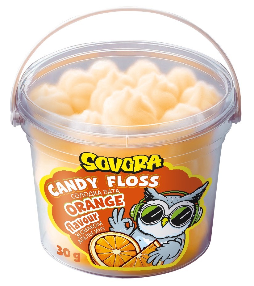 Cukrová vata SOVORA s pomerančovou příchutí je lehká a nadýchaná sladkost známá z dětství. Je vyrobena z cukru s přídavkem aroma „Pomeranč“. Má výraznou citrusovou chuť a atraktivní barvu.
