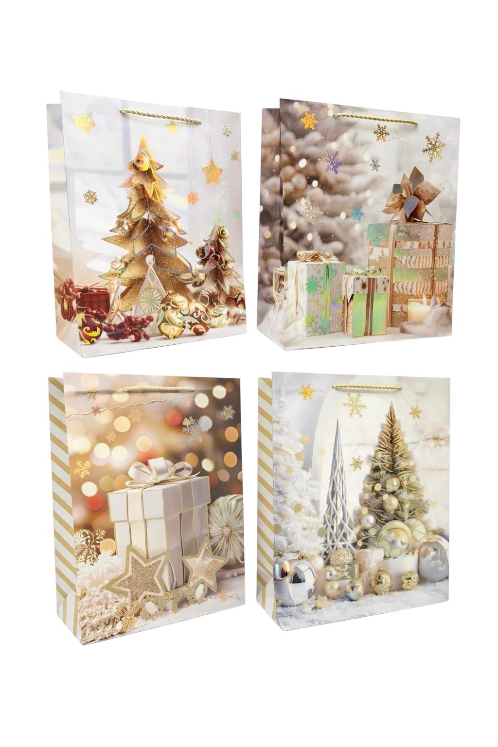 Dárková taška o velikosti 26×32 cm, vyrobená z pevného a odolného materiálu, určená k balení dárků různých tvarů a velikostí. Ozdobena slavnostním motivem s obrázky vánočních stromků a dárků, který dodává obalu vánoční a slavnostní vzhled.