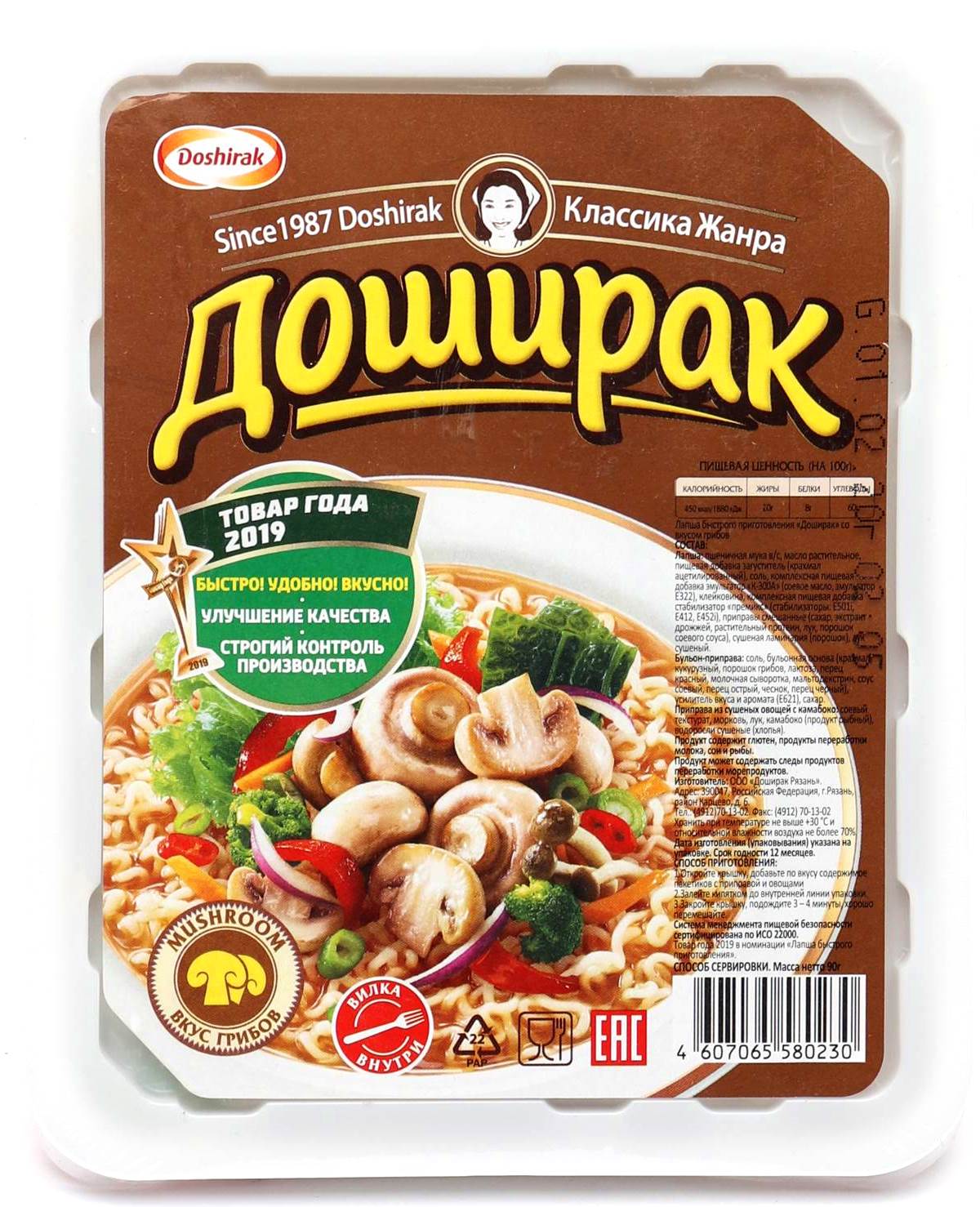 Složení: nudle (prémiová pšeničná mouka, rostlinný olej, zahušťovadlo potravinářských přísad (acetylovaný škrob), sůl, emulgátor potravinářských přísad „K-300A“ (sójový olej, E322), lepek, komplexní stabilizátor potravinářských přísad „premix“ (E501i, E412, E452i), "sójový" výrobek (prášek ze sójové omáčky, cukr, sůl, kvasnicový extrakt, smažená cibule), sušená cibule. Sůl, polévka-koření (vývar základna (kukuřičný škrob, houbový prášek, laktóza, červená paprika, syrovátka, maltodextrin, sójová omáčka, feferonka, česnek, černý pepř), látka zvýrazňující chuť a aroma E621, cukr. Koření sušené zeleniny s kamaboko: sójový texturát, mrkev, cibule, kamaboko (rybí výrobek), sušené mořské řasy (vločky).