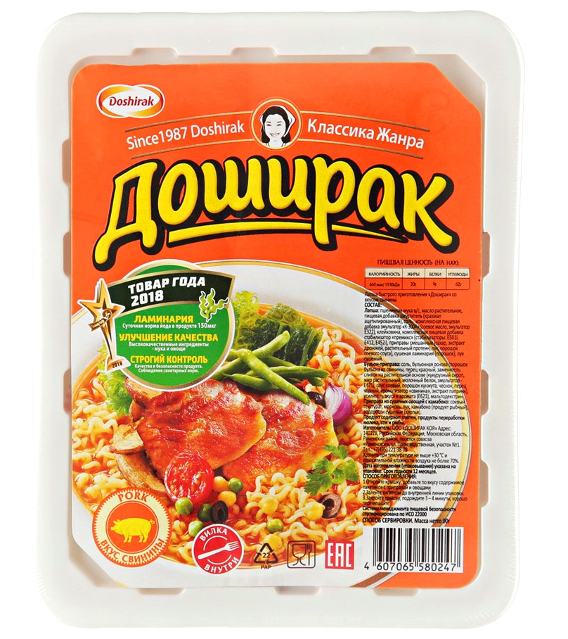 Složení: nudle (prémiová pšeničná mouka, rostlinný olej, zahušťovadlo potravinářských přísad (acetylovaný škrob), sůl, emulgátor potravinářských přísad „K-300A“ (sójový olej, E322), lepek, komplexní stabilizátor potravinářských přísad „premix“ (E501i, E412, E452i), sójový produkt (prášek ze sójové omáčky, cukr, sůl, kvasnicový extrakt, smažená cibule), sušená cibule. Kořenící vývar (sůl, vývar na bázi (prášek vepřového vývaru, červená paprika, rostlinná náhražka smetany (kukuřičný sirup, rostlinný tuk, mléčná bílkovina, emulgátor E471), sójová omáčka, sezamový prášek, česnek, vepřová příchuť, paprikový extrakt, černý pepř), zesilovač chuti a aroma Е621, maltodextrin. Kořenící sušená zelenina z kamaboko: sójový texturát, mrkev, cibule, kamaboko (rybí výrobek), sušené mořské řasy (vločky).