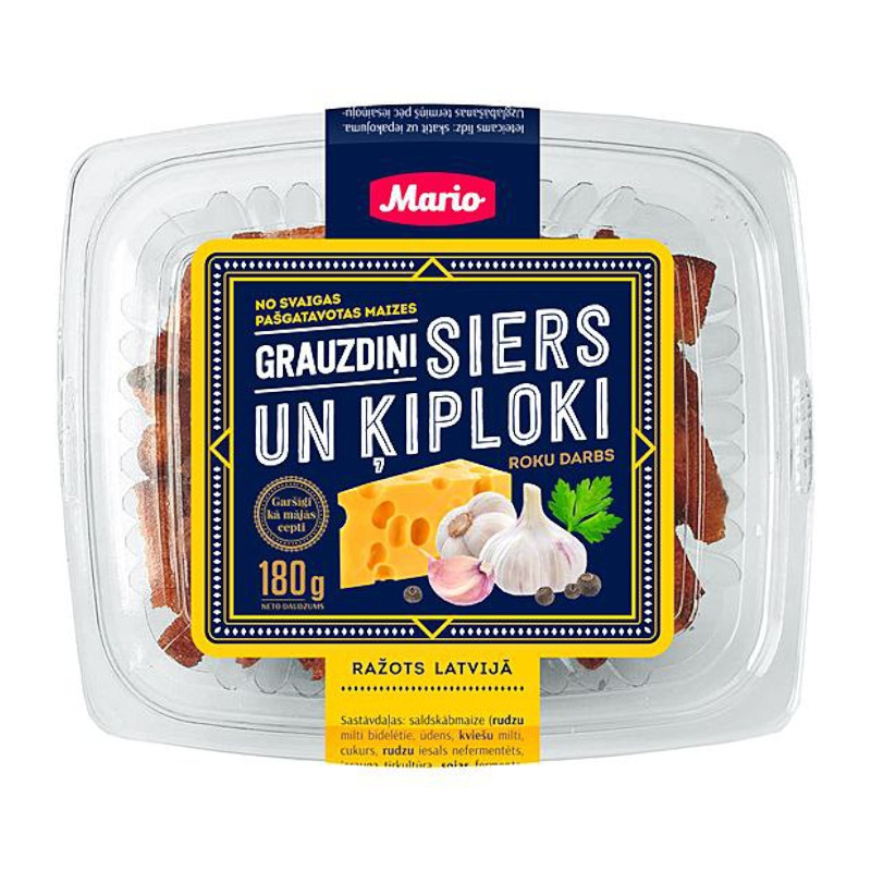 Složení: kváskový chléb (žitná mouka, voda, pšeničná mouka, světlý invertní sirup (cukr, voda, regulátory kyselosti: kyselina citronová, hydrogenuhličitan sodný), žitný slad, kvásek (žitná mouka, voda, kvasnicová kultura), zlepšující přísada (pšeničná mouka, zvýrazňovač ( pšeničná mouka, pšeničná sladová mouka, pšeničný lepek, acerola mouka, enzymy), droždí, sůl, řepkový olej, kmín, pšeničné otruby), rafinovaný řepkový olej, sýrový prášek 5,4% (sýr, emulgátor: E339ii), česnek 1,4%.