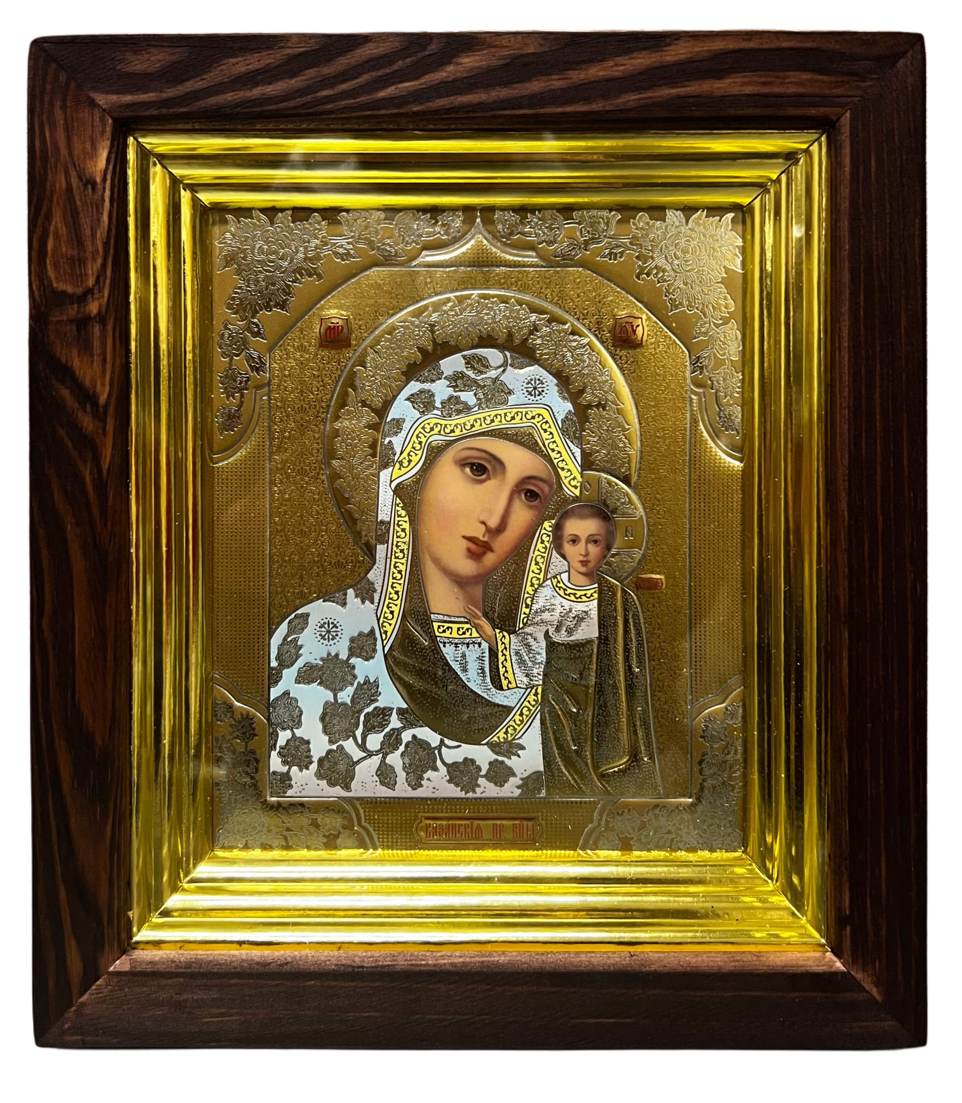 Ikona dřevěná se sklem 15x18cm Kazanskaja (zlatá)