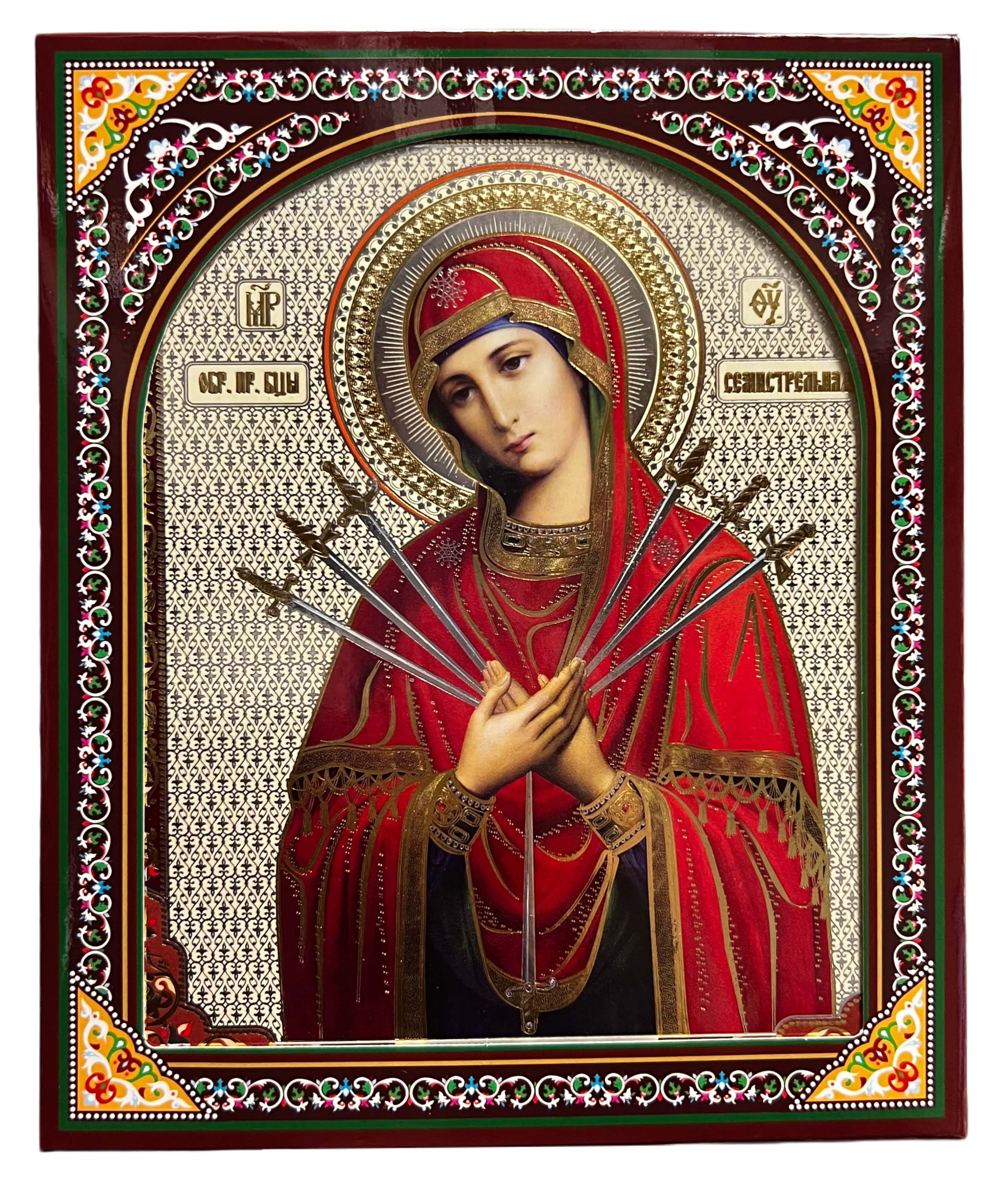 Ikona dřevěná Semistrelnaja 15×18 cm v pouzdře (zlaté pozadí)