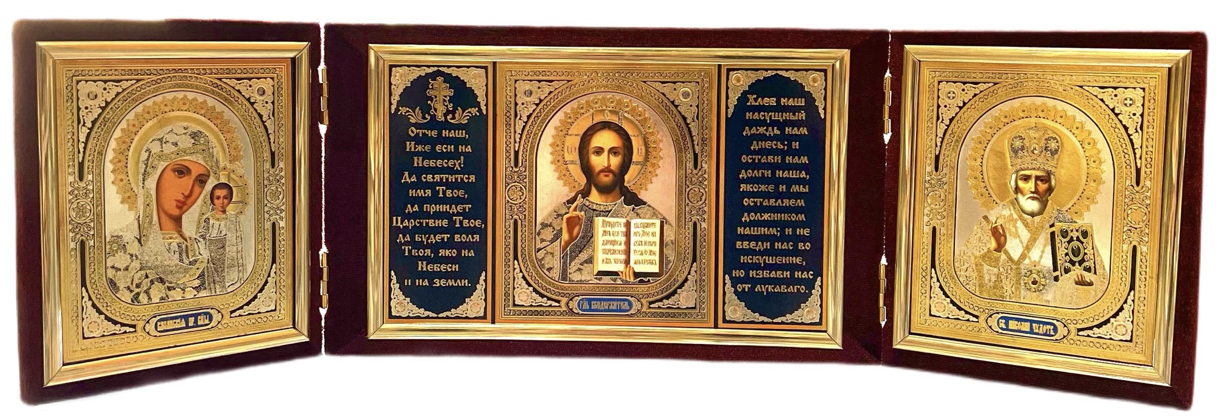 Čtyřstranná ikona Nikolaj a Kazaňská v sametu o rozměru 12x40 cm je jako duchovní poklad, který oživí váš prostor svou krásou a svatostí. Na této ikoně jsou zobrazeni Svatý Nikolaj a Kazaňská Matka Boží — symboly naděje, ochrany a lásky. Jejich obrazy jsou pečlivě zpracovány na sametu s přesností a detailností, což dává ikoně zvláštní eleganci a hloubku. Skládací konstrukce činí ikonu praktickou a pohodlnou pro přenášení, takže ji můžete mít stále u sebe, kdykoli a kdekoli. Přineste duchovní inspiraci a klid do svého domova s touto krásnou ikonou Nikolaje a Kazaňské Matky Boží.