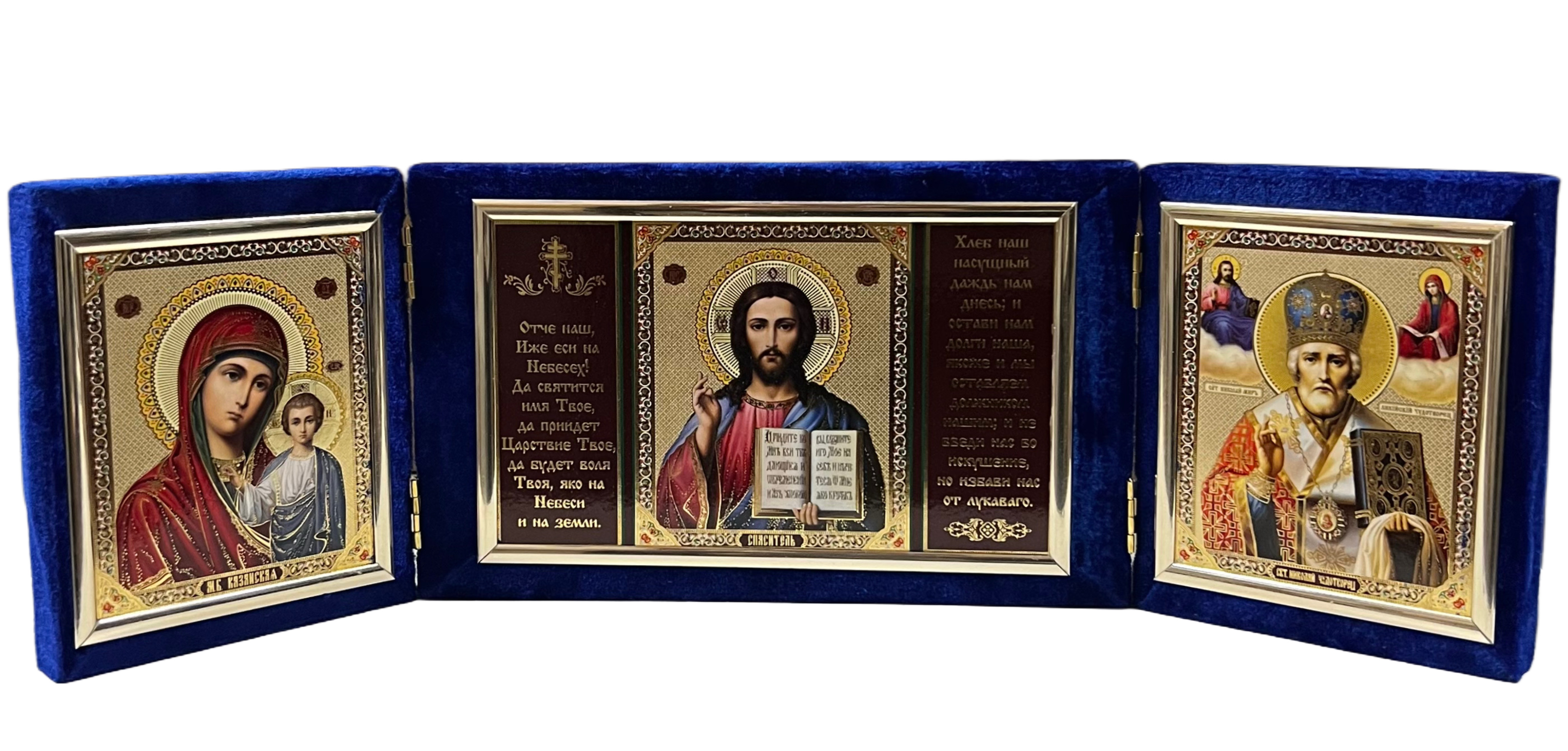 Ikona v sametu zlatá Nikolaj a Kazanskaja 12x40cm skládací 3(modrá)