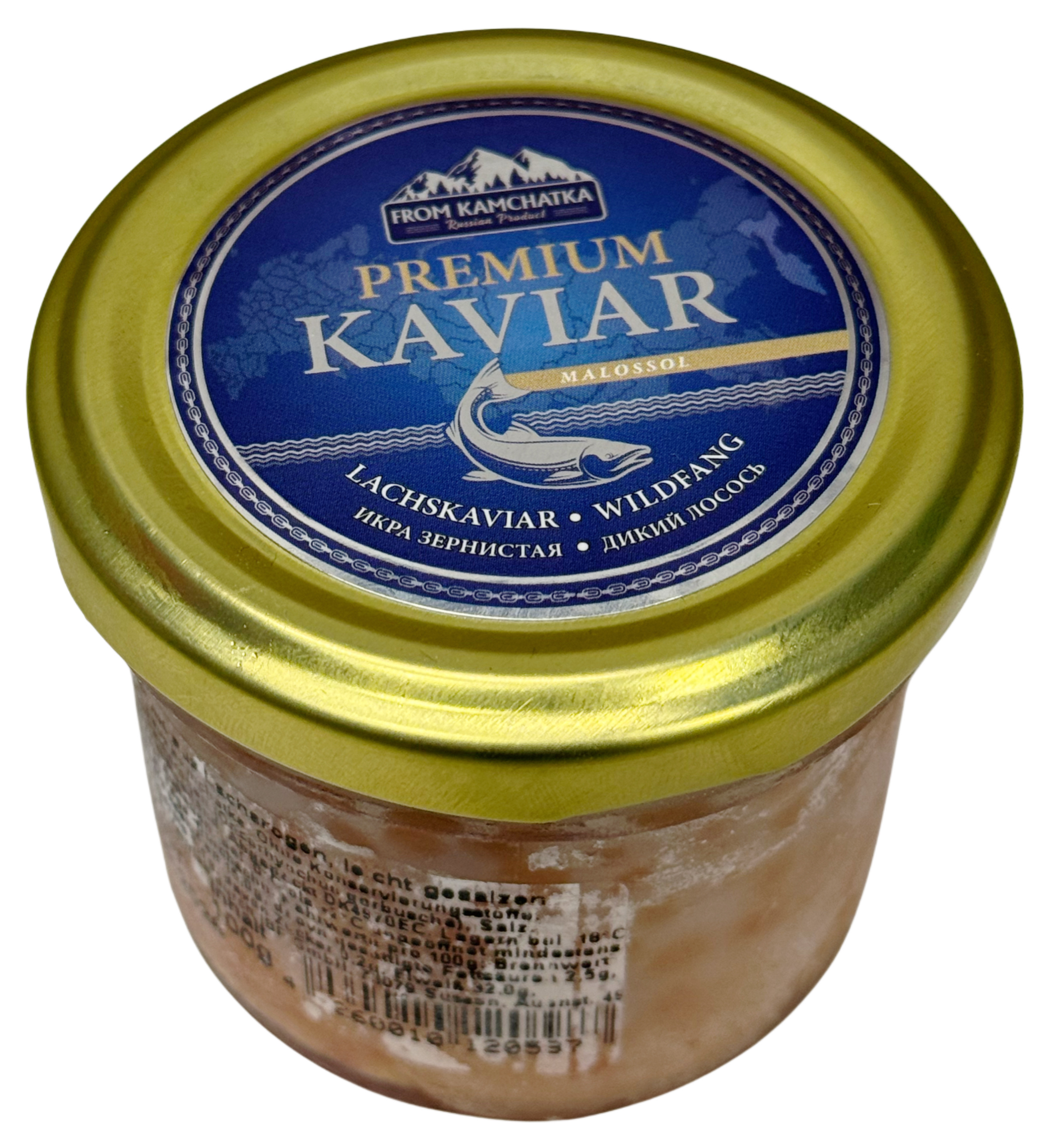 Prémiový mražený kaviár z gorbuši z Kamčatky je vysoce kvalitní produkt s velkými, jasně oranžovými zrny a jemnou maloslanou chutí. Díky rychlému zmrazení a šetrnému solení si kaviár uchovává čerstvost, jemnou texturu a šťavnatost.