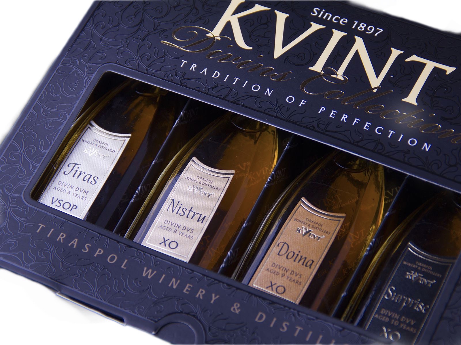 Kolekce brandy 4x0,05L 40% KVINT Zahrnuje 4 miniaturní lahve – Tiras (6 let), Nistru (8 let), Doina (9 let), Surprise (10let). Vysoce kvalitní brandy zrající v dubových sudech nabízí znamenitý nápoj zlaté jantarové barvy s bohatě vyvinutým aroma květin, vanilky a ovoce. Chuť brandy je měkká a dlouhotrvající.