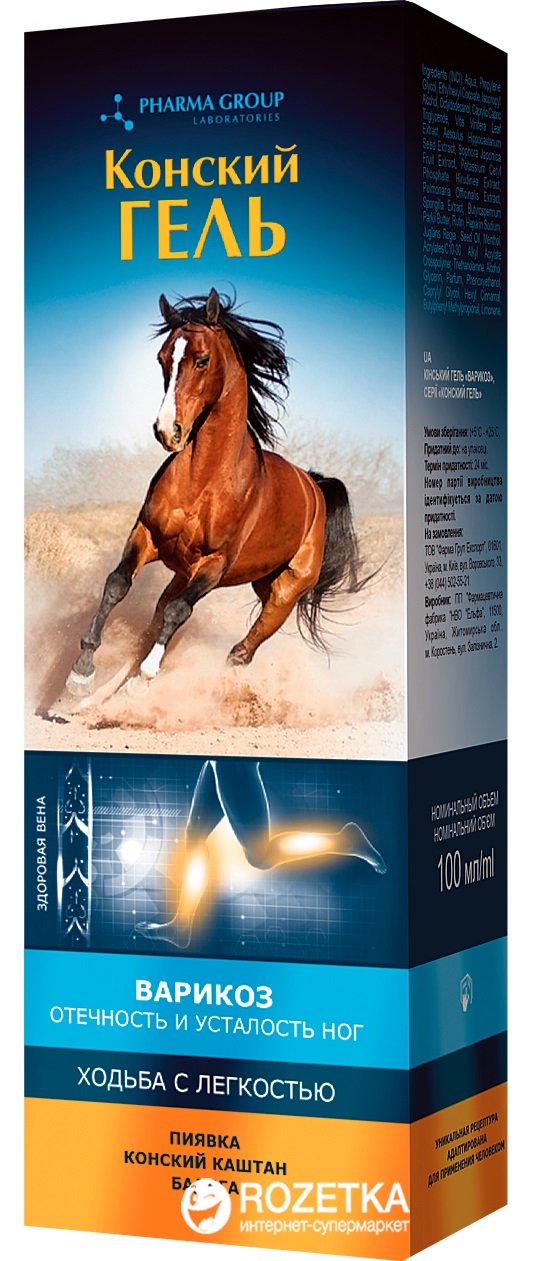 Koňský gel "Varikoz" je speciálně navržen pro pokožku se známkami křečových žil. Gel je optimální formou přípravku pro pomocnou péči o pleť se známkami křečových žil. Jeho lehká a rychle se vstřebávající konzistence zajišťuje vysoký průnik účinných látek přes kožní bariéru. Obsahuje aktivní složky, které pomáhají zlepšit stav pokožky s křečovými žilami. Jírovec maďal - zlepšuje mikrocirkulaci v horních vrstvách pokožky, což pomáhá zlepšit výživu buněk a obnovit pružnost pokožky. Extrakt z pijavice tonizuje pokožku, zmírňuje záněty a otoky, snižuje ochablost pokožky, zlepšuje její elasticitu. Badyaga aktivuje krevní oběh a metabolické procesy v kůži, odstraňuje pocit těžkosti a únavy v nohou. Listy červeného hroznu mají venotonický a antioxidační účinek. Snižte otoky, zvyšte tonus žilních stěn, zabraňte rozvoji křečových žil. Rutin účinně posiluje kapiláry, snižuje propustnost cév a činí je pružnějšími.