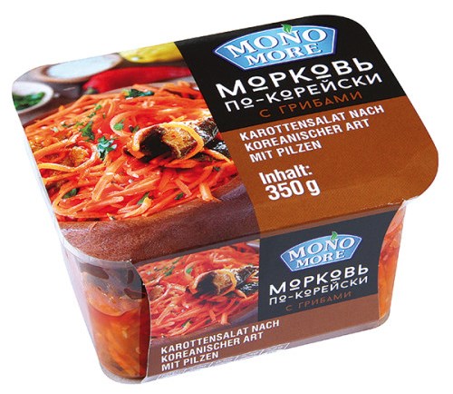 Složení: mrkev 75%, Jidášovo ucho (houby), řepkový olej, česnek, sójová omáčka (voda, sójové boby, pšeničná mouka, konzervant: E202), cukr, sůl, sezam 1,6%, ocet z octové esence, koření, konzervační látky: E202, E211; barvivo: extrakt z papriky, chilli 0,01%, olivový olej.