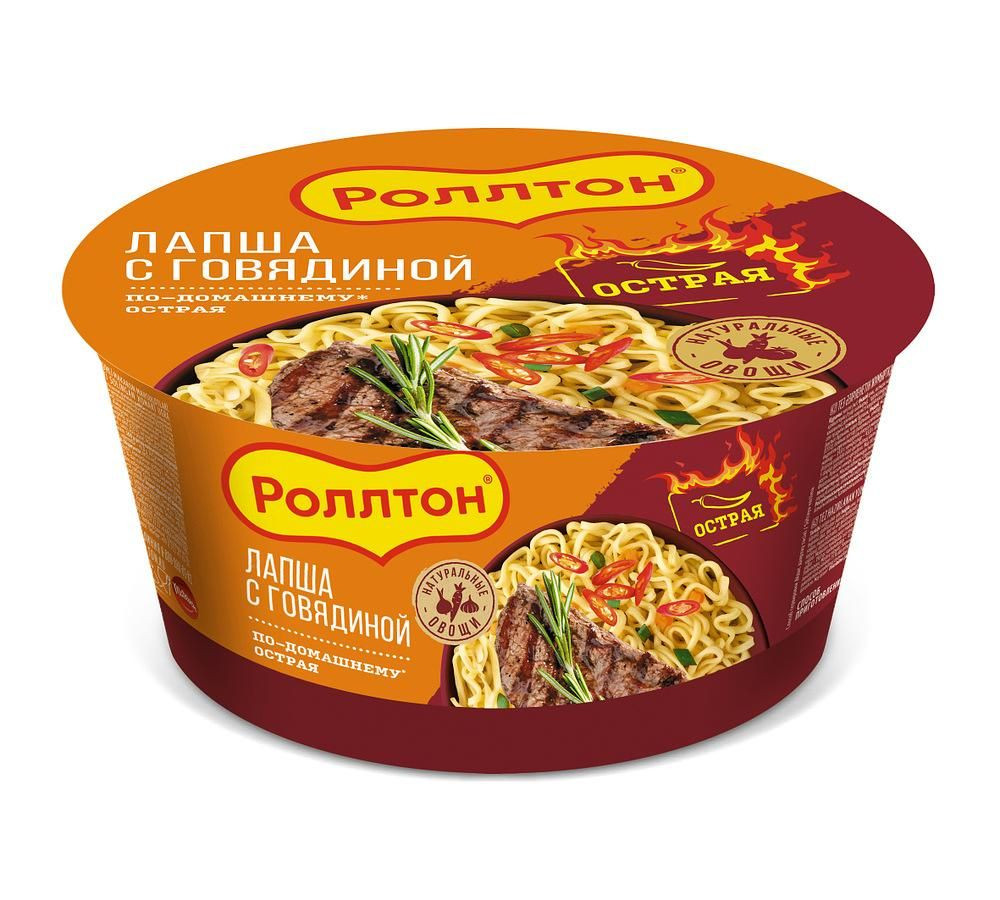 Rychlovarné nudle značky „Rollton“ s domácím hovězím masem jsou vydatné a aromatické jídlo s mírnou pálivostí, které se připraví během 5 minut. Kombinace vaječných nudlí, sušeného hovězího masa a koření, jako je zázvor a černý pepř, jim dodává bohatou chuť a příjemnou vůni. Ideální pro rychlý oběd nebo svačinu.
