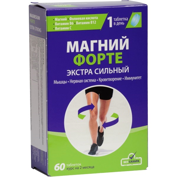 Složení: (aktivní látky) 1 tableta (denní příjem) obsahuje: hořčík - 250 mg (66,7 %), vitamin B6 - 1,4 mg (100 %), vitamin B12 - 2,5 mcg (100 %), kyselina listová - 200 mcg (100 %) , vitamín C - 80 mg (100 %). Pomocné složky: sorbitol, polyethylenglykol, stearát hořečnatý, mastek.