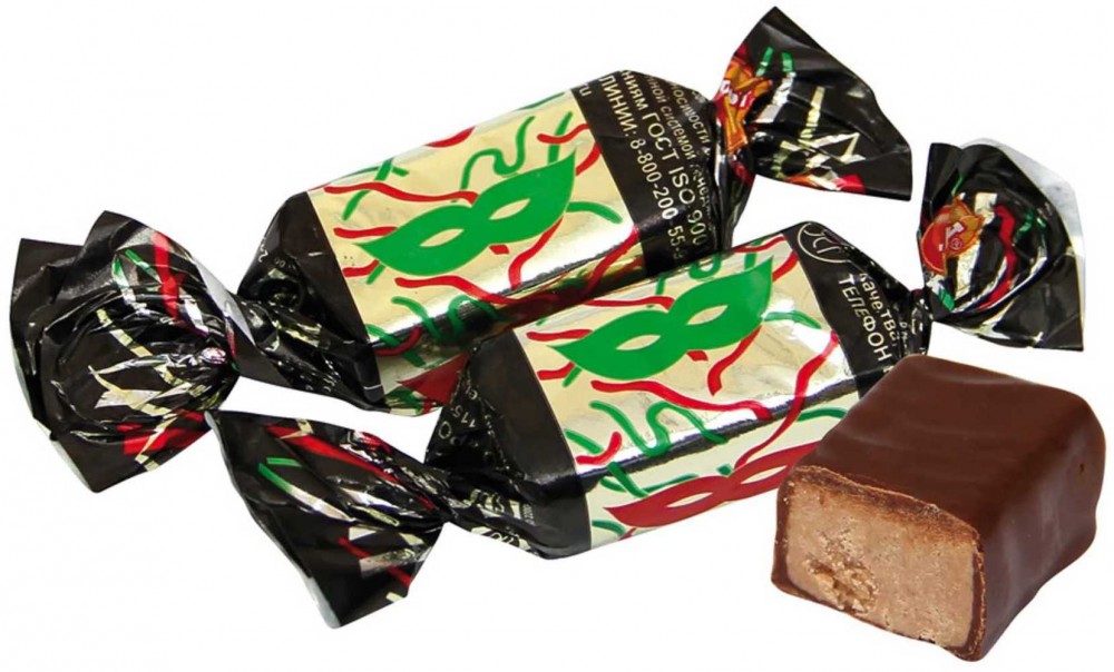 Čokoládové bonbony "Maska" se slavnostním zdobením, vytvořené z voňavé pralinky s tóny arašídů a kakaa, pokryté zvlněnou vrstvou čokoládové polevy. Příjemná, středně nasládlá chuť a sametová textura, rozplývající se s každým douškem čaje nebo kávy, dodává pozitivní emoce a porci dobré nálady.
