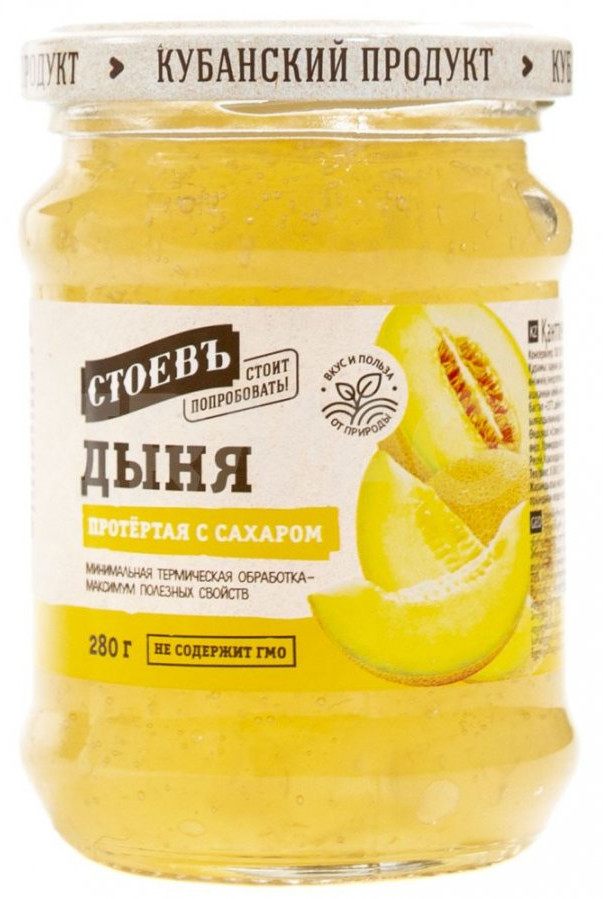 Melounová kaše se cukrem od značky „Stojev“ je přírodní produkt, připravený z dužiny melounu s přídavkem cukru. Má jemnou pyré konzistenci a výraznou sladkou chuť melounu. Tento produkt je ideální jako doplněk k čaji, pro podávání s palačinkami a lívanci, stejně tak pro použití v domácí pečení a dezertních receptech.