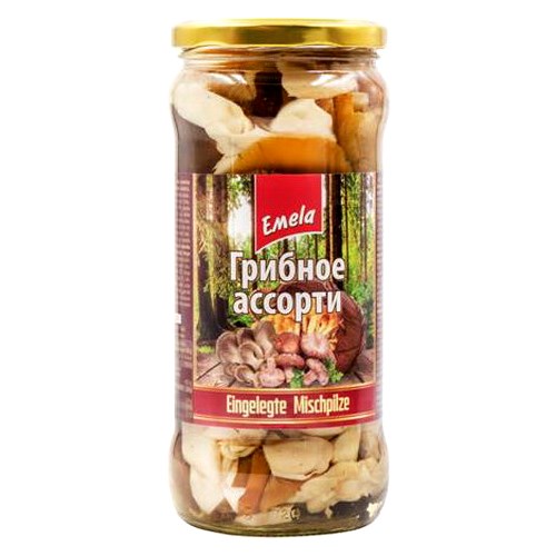 Složení: hlívy, klouzci, václavky, žampiony, slámové houby (smorčky), voda, sůl, česnek, koření (bobkový list, pepř, kopr),  kyselina citrónová, antioxidant kyselina askorbová, koření.