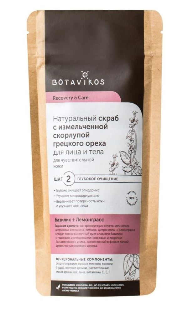 Přírodní peeling s drcenými skořápkami z ořechů na obličej a tělo. Pro citlivou pokožku. Funkční složky: jemně mleté ​​ořechové skořápky (prášek), extrakt z arniky, rostlinné oleje z arganového, bambuckého, lněného, ​​vitamíny C, E, F. Peeling hluboce čistí, zlepšuje mikrocirkulaci, vyrovnává povrch pokožky a zlepšuje pleť. Základem pro hloubkové čištění v drhnutí je drcené ořechové skořápky (prášek). Díky jemnému broušení abrazivní prvky nepoškozují pokožku, jemně odstraňují odumřelé buňky z jejího povrchu, vyrovnávají úlevu a stimulují proces obnovy buněk. Botanický extrakt z arniky, oleje a vitamíny jsou odpovědné za jemný přístup k charakteristikám citlivé pokožky.
