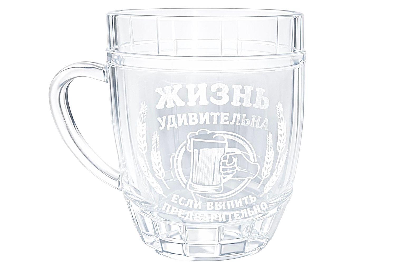 Pivní korbel o objemu 0,5 litru s humorným nápisem „Žizň udivitelna, jesli vypit predvaritelno“ je určen k podávání piva a jiných nápojů. Je vyroben z kvalitního skla, které zajišťuje dlouhou životnost a pohodlné používání. Skvěle se hodí pro domácí použití, do barů, restaurací nebo jako originální dárek s veselou náladou.