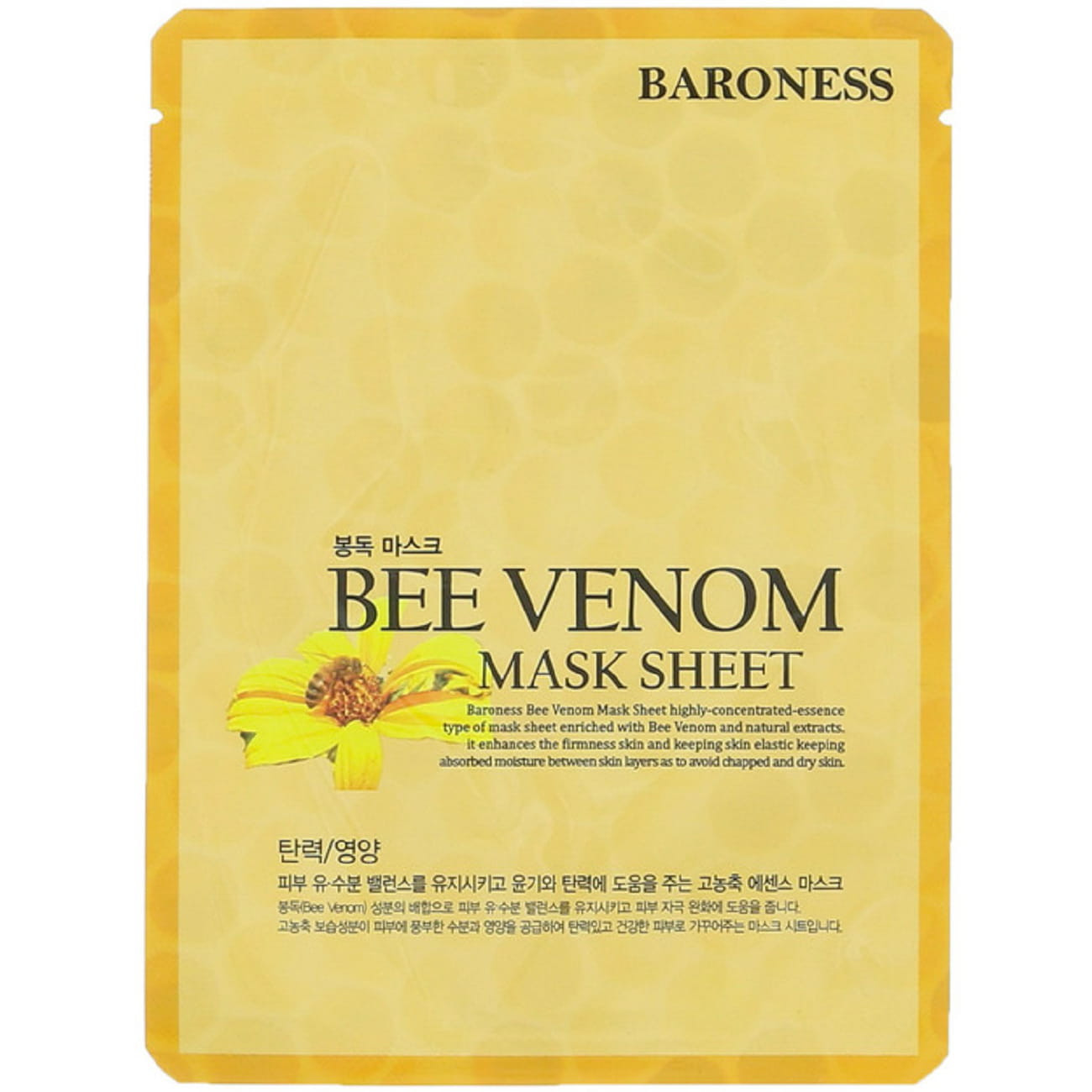 Vyživující a hydratační jednorázová pleťová maska s včelím jedem. Maska regeneruje, vyživuje, vyhlazuje pokožku a redukuje vrásky. Včelí jed bojuje proti známkám stárnutí a obnovuje ztrátu pružnosti. Maska zanechává pokožku zářivou a pružnou. Aloe vera hydratuje a osvěžuje pokožku. Extrakt zeleného čaje revitalizuje unavenou pleť. Extrakt portulaky předchází vzniku vrásek a jemných linek.