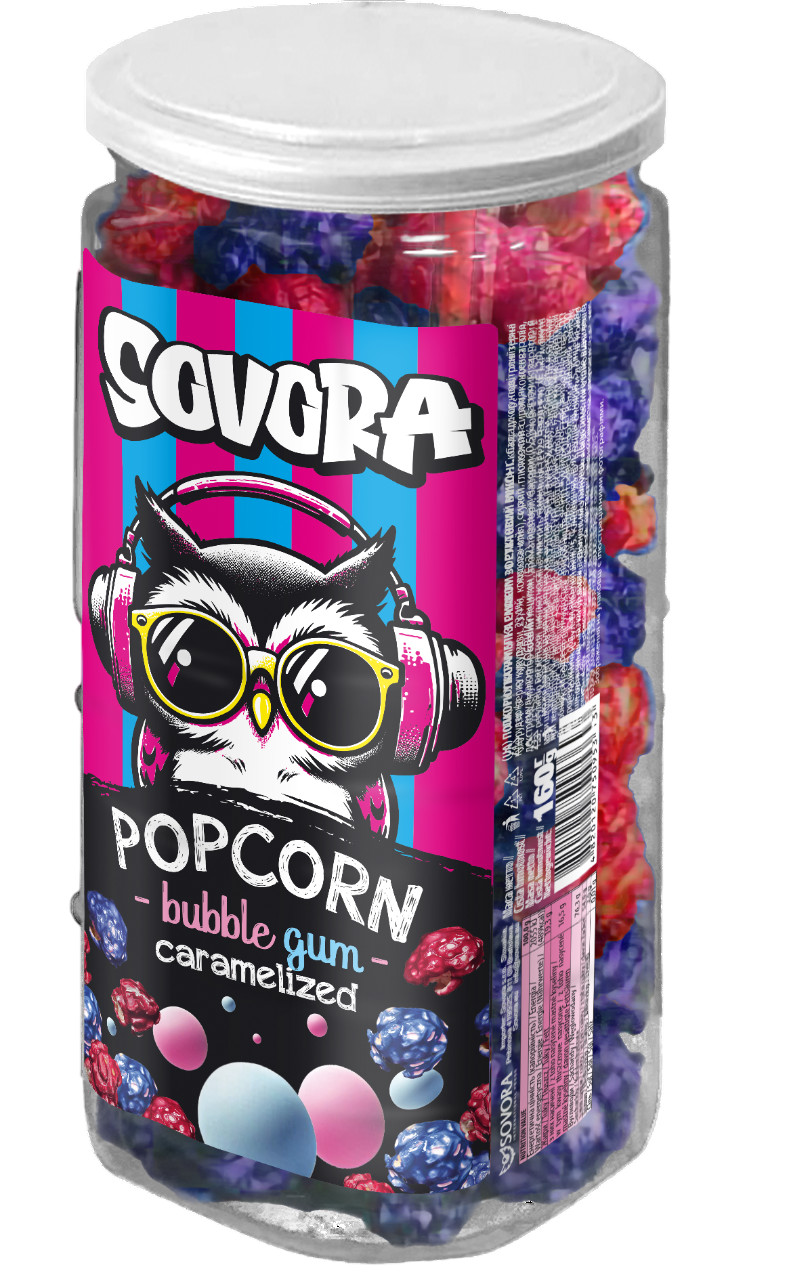 Nasaďte si jasnou sladkou chuť dětství s naším popcornem Sovora! Křupavá nadýchaná zrna s nepřekonatelnou chutí Bublle Gum — ideální svačina při filmech, oslavách nebo jen pro sladkou náladu. Praktické balení 160 g zachovává čerstvost a aroma, aby vás potěšilo kdykoli.
