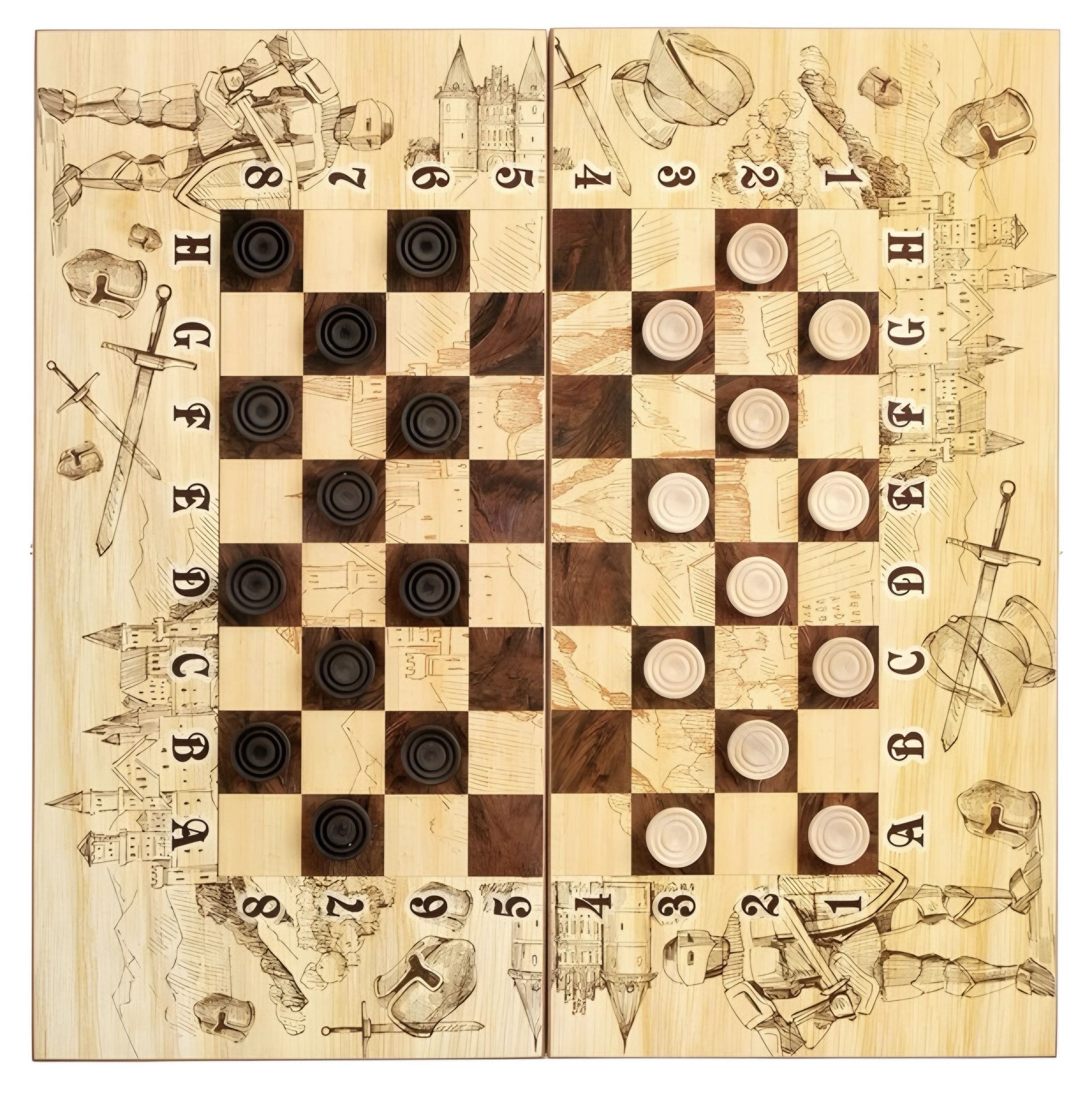 Sada "Šachmaty, šašky, nardy Rytíř" je univerzální sada pro deskové hry, spojující tři klasické hry v jednom produktu.