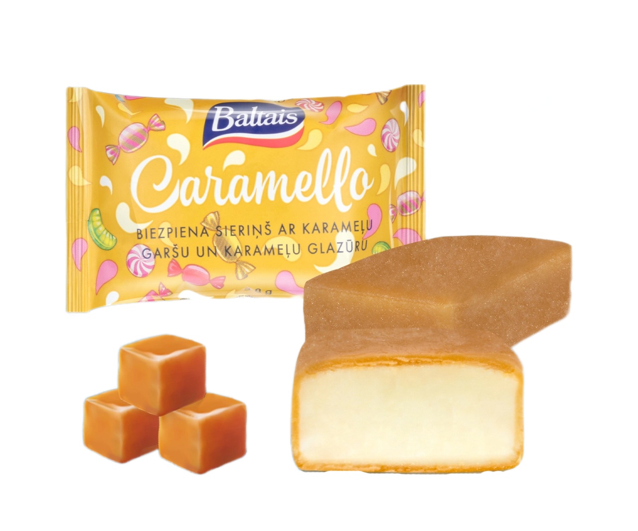 Glazovaný sladký tvaroh Baltais s karamelovou polevou — je to malý porční dezert, který se skládá z jemné tvarohové hmoty a karamelového obalu. Produkt je mražený nebo chlazený, určený jako lehký dezert nebo svačina.