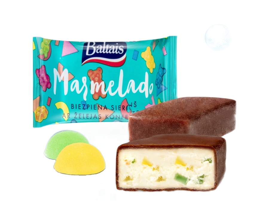 Tvarohová tyčinka s kousky želé Baltais, 38 g — je to glazovaný dezert z jemného tvarohu s přídavkem ovocného želé. Je pokrytá tenkou vrstvou čokoládové polevy a uvnitř se nachází měkká tvarohová hmota s jasnými, sladkými kousky želé, které dodávají zajímavou texturu a chuť. Produkt má příjemné aroma a mírnou sladkost, hodí se jako lehká svačina nebo dezert. Balený je v jednotlivém obalu, vhodný ke konzumaci na cestách.
