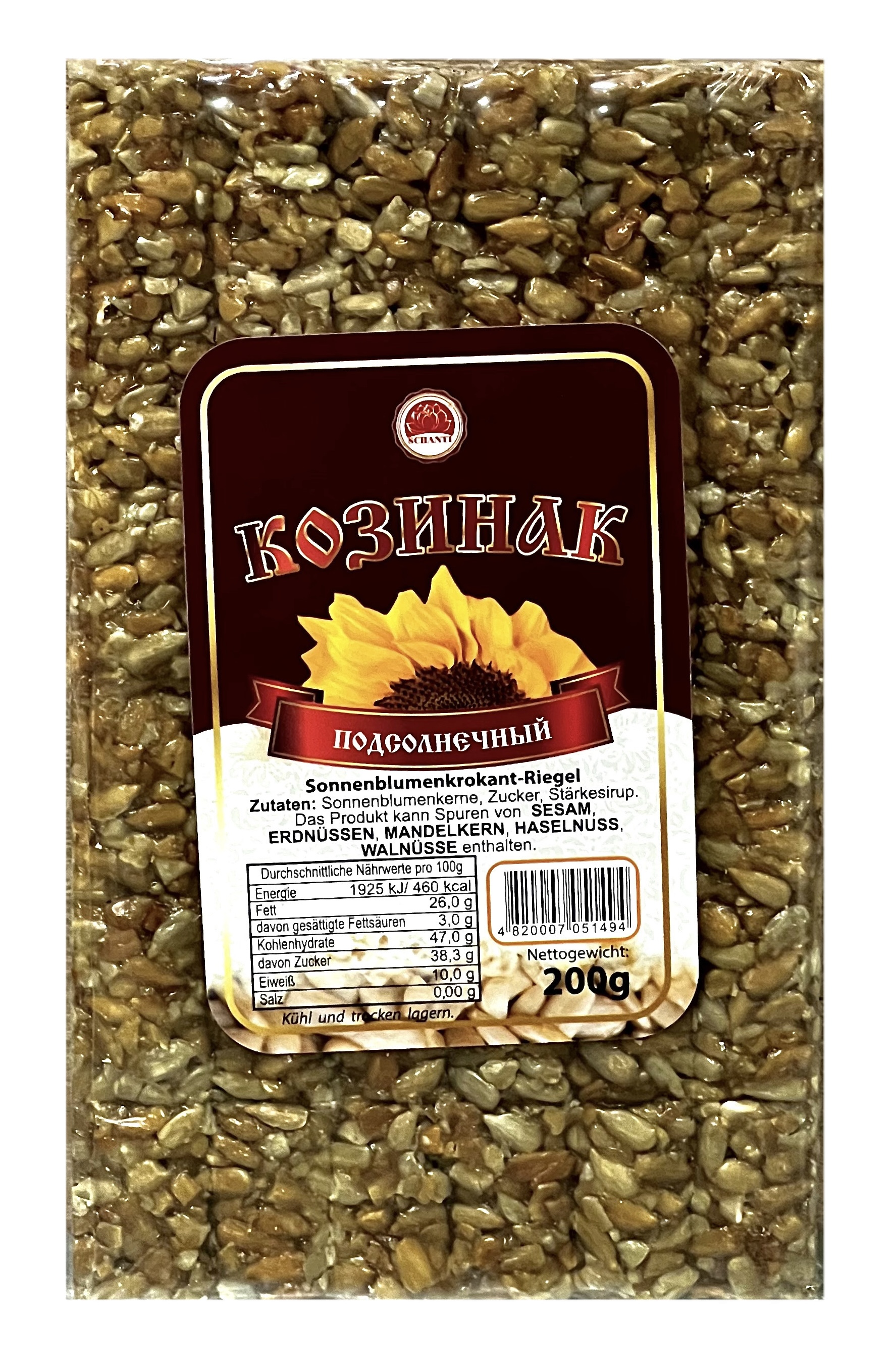 Kozínek slunečnicový 200 g Schanti je sladká pochoutka vyrobená z pražených slunečnicových semínek, které jsou slepeny cukrem a tvoří křupavou a výživnou hmotu. Tento kozínek je vynikajícím zdrojem energie díky vysokému obsahu bílkovin, vlákniny a zdravých tuků. Ideální pro rychlou svačinu nebo jako doplněk k čaji.