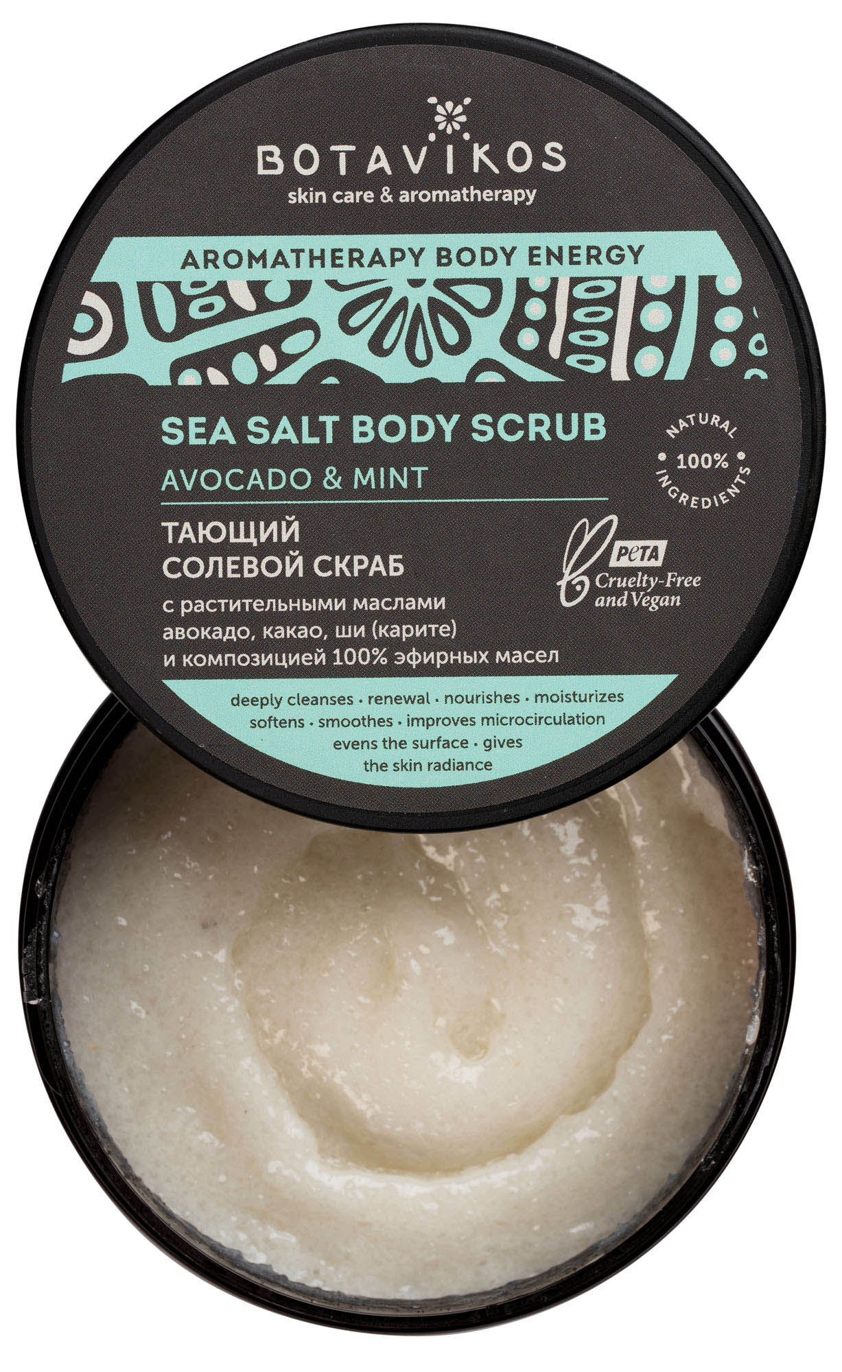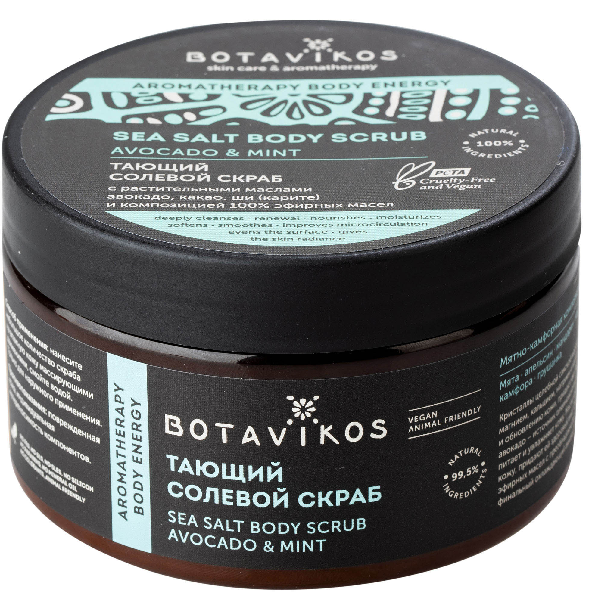 Avokádo a máta. Krystaly léčivé mořské soli Saki, bohaté na jód, hořčík, vápník, sodík a draslík, pomáhají očistit a obnovit pokožku, dodávají jí hladkost a tonus. Avokádový olej - zdroj kyseliny olejové a vitamínů A, E, D, vyživuje a zvlhčuje pokožku. Kakaové máslo a bambucké máslo dokonale zjemňují pokožku a dodávají jí zdravý vzhled. Svěží vůně složení éterických olejů s převládajícím mátovým tónem dodává finální chladicí akord, plní energii a oživuje.