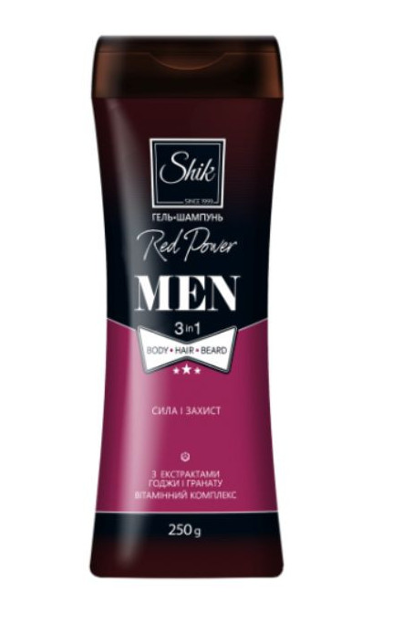 Sprchový gel a šampon Shik Men 3v1 Red Power — multifunkční přípravek vyvinutý speciálně pro muže. Vhodný pro každodenní péči o tělo, vlasy a obličej. Energizující formule účinně čistí pokožku a vlasy, dodává pocit svěžesti a síly a podporuje pocit vitality po celý den.