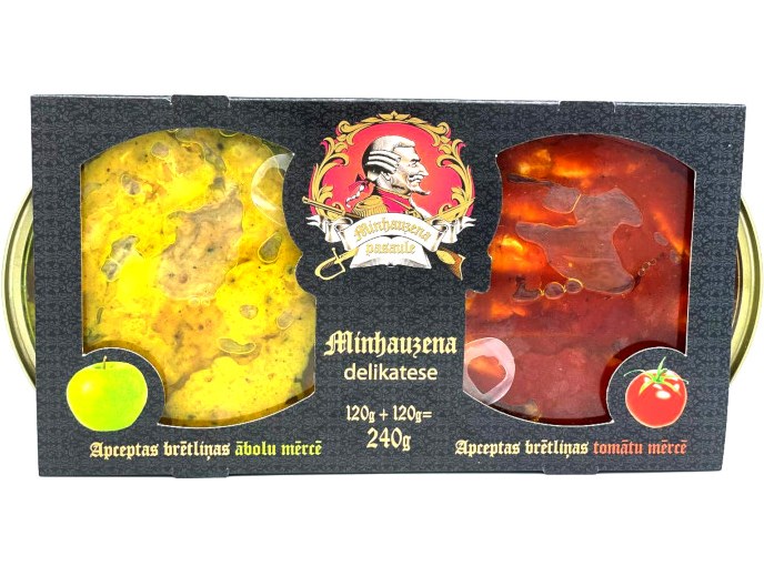 Složení: smažené šproty (Sprattus sprattus) 70% (šproty bez hlavy, řepkový olej, pšeničná mouka), jablečné pyré 30% (jablečné pyré, pitná voda, cukr, řepkový olej, sůl, sušená cibule), regulátor kyselosti - kyselina octová, koření) .