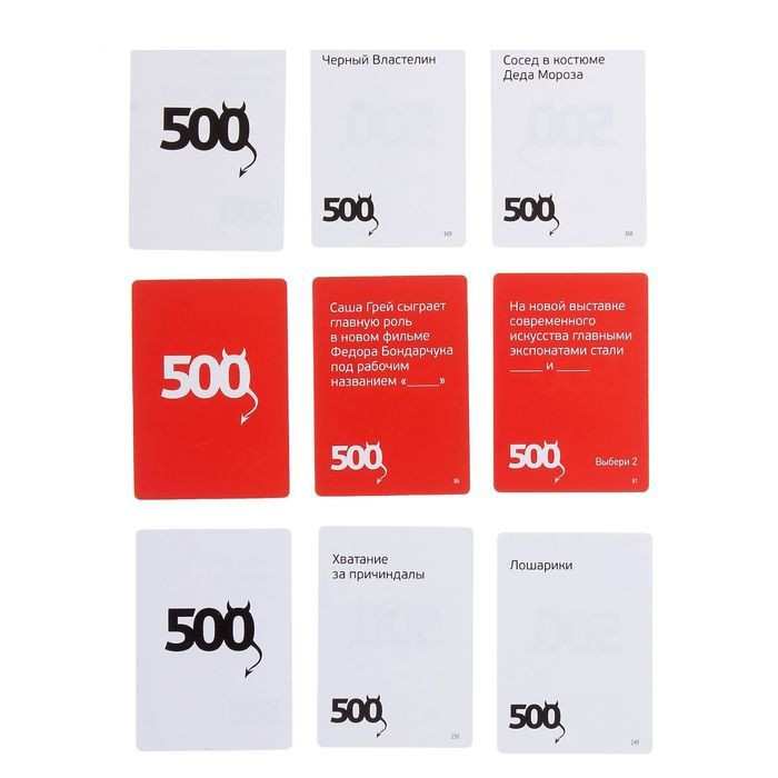 Stolní hra "500 zlobnyh kart 3.0. Novyj God" (od 18 let) je jednoduchá a zábavná stolová hra pre dospelých. Karty sú samozrejme zlé, niekedy dokonca hrozné, ale pri správnom zaobchádzaní s nimi sa stávajú veľmi vtipnými. Dokážete ovládnuť týchto päťsto zlých kariet a poriadne sa zabaviť?!