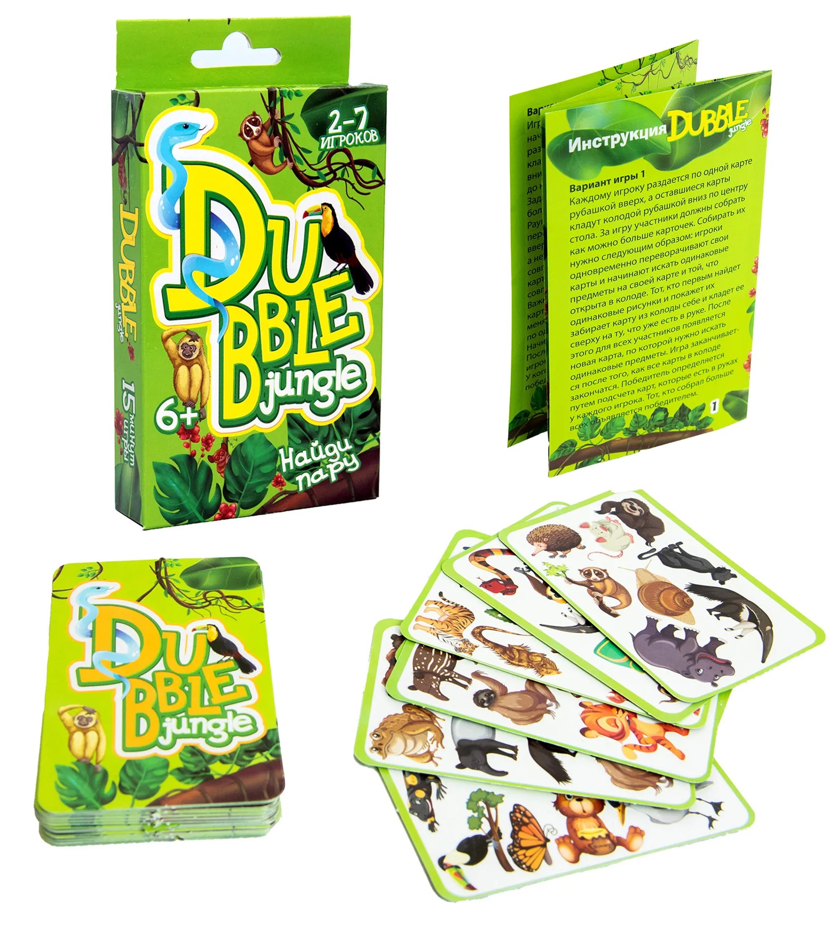 Stolní hra "Dubble-jungle" (od 6 let) je aktivní karetní hra na rychlé hledání shod. Děti musí porovnávat svou kartu s ostatními kartami a co nejrychleji najít stejné obrázky. Vítězem se stává ten, kdo nasbírá více karet se shodnými obrázky. V této hře budou muset využít veškerou svou pozornost, obratnost a paměť. Takže zábavná činnost se promění v opravdový trénink.