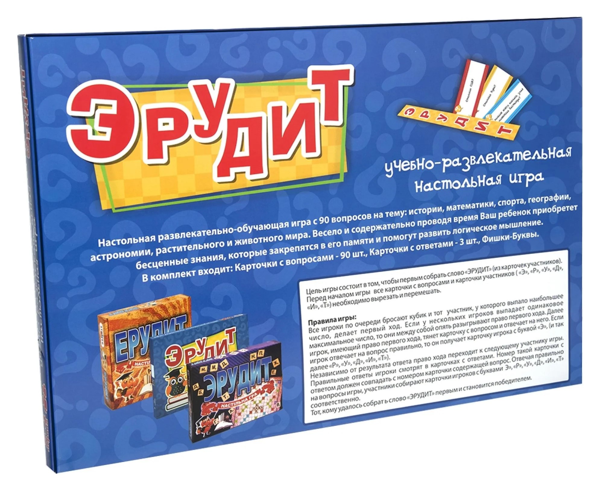 Stolní hra "Erudit" (od 6 let) je zajímavá intelektuální hra, která okamžitě zaujme malé zvědavce. Pravidla hry jsou docela jednoduchá. Pokud hráč správně odpoví na jednu z otázek "co? kde? kdy?", dostane žeton s písmenem. Poté, v souladu s pravidly, aby zvítězil, musí účastník sestavit slovo "Erudit". Podrobnější informace o pravidlech hry naleznete v přiloženém návodu.