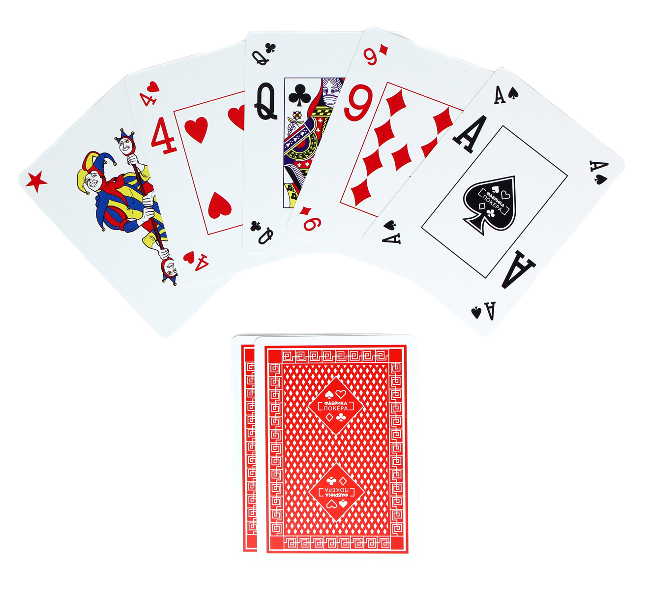 Balíček obsahuje 54 plastových karet s dvojitým indexem od Pokerové továrny.