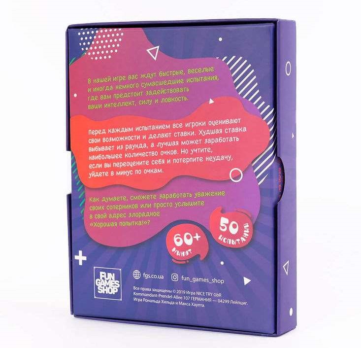 V naší hře vás čekají rychlé, veselé a občas trochu šílené výzvy, při kterých budete muset zapojit svůj intelekt, sílu a obratnost. Myslíte si, že dokážete získat respekt svých soupeřů, nebo jen uslyšíte zlobné "Hezký pokus!"? Stručně o pravidlech: Před každou výzvou všichni hráči hodnotí své schopnosti a sází. Nejhorší sázka vypadne z kola, zatímco ta nejlepší může vydělat nejvíce bodů. Ale dejte si pozor, pokud se přeceníte a neuspějete, skončíte s mínusem bodů.